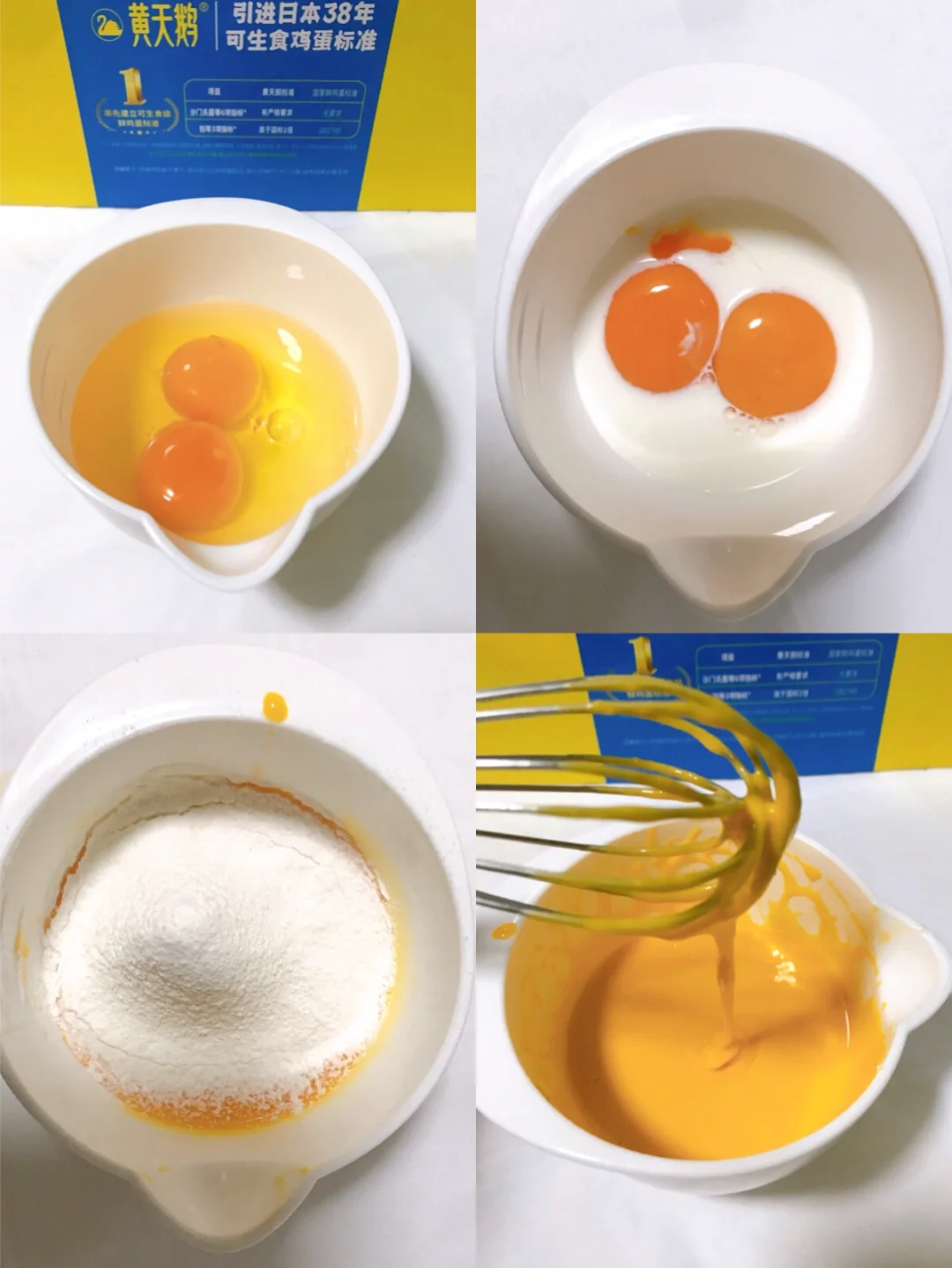 可生食鸡蛋2个,牛奶20g,低筋面粉20g,细砂糖10g。