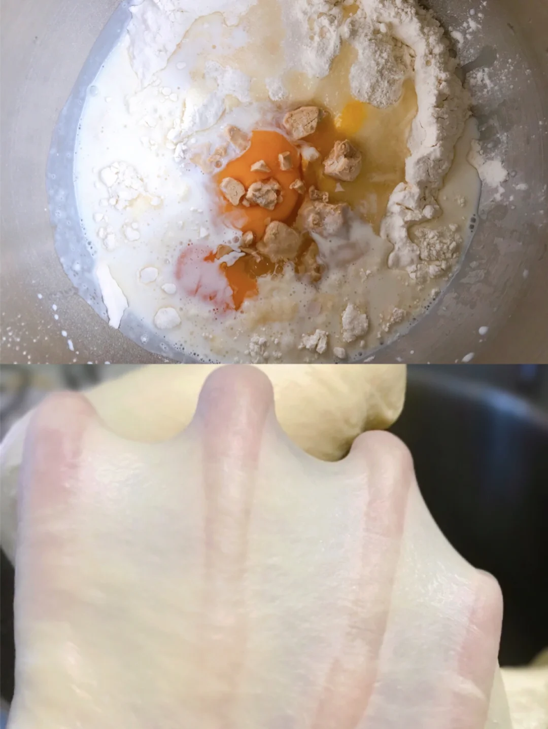 1️⃣除黄油以外的所有面团材料放入厨师机桶内厨师机1或2档搅拌至无干粉,切换至5~6档打面10分钟左右,能扯出厚膜,加入软化好的黄油开3档揉至黄油吸收,再切换至5-6档揉至完全拓展阶段,能扯出薄膜即可。