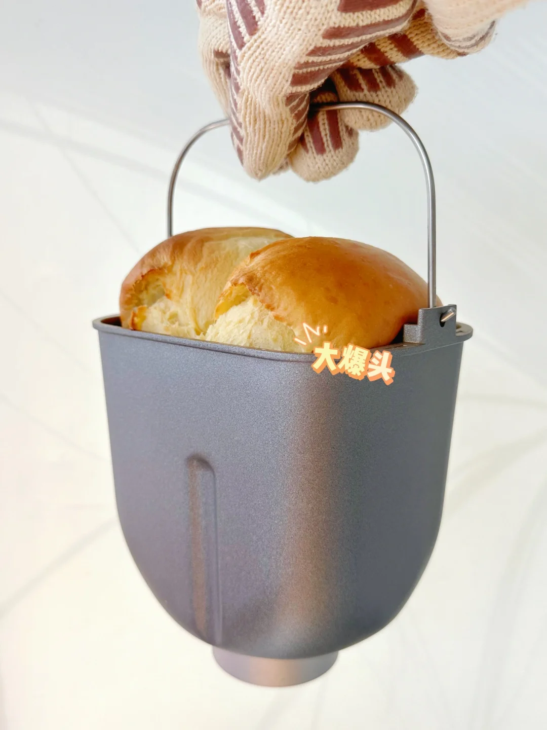 5️⃣整形好以后将搅拌叶片取出,放入整形好的面团,剩余1小时35分钟的时候会开始发酵,发酵一个小时,发酵好的时候可以表面刷上一层蛋液,剩余35分钟的开始烘烤。