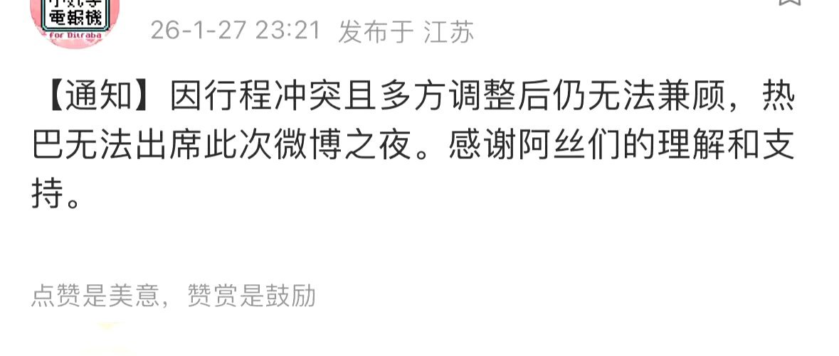 红毯可是巴粉的命啊 怎么取消了呢可能是微博之夜不好给我巴姐安排座位 毕竟今年没什么好剧 害怕面子上过不去工作室想的很周到 给工作室点赞 很妥当