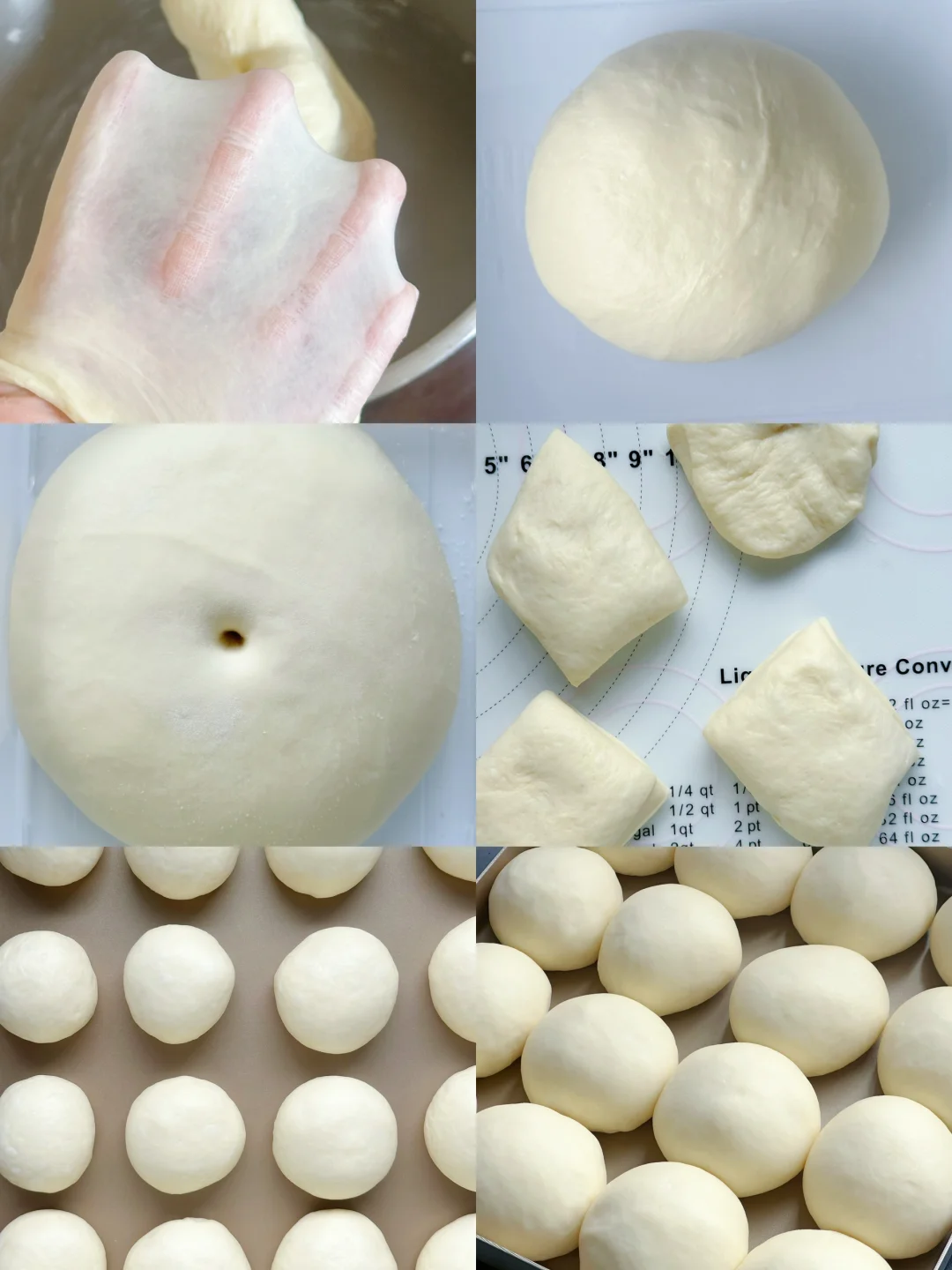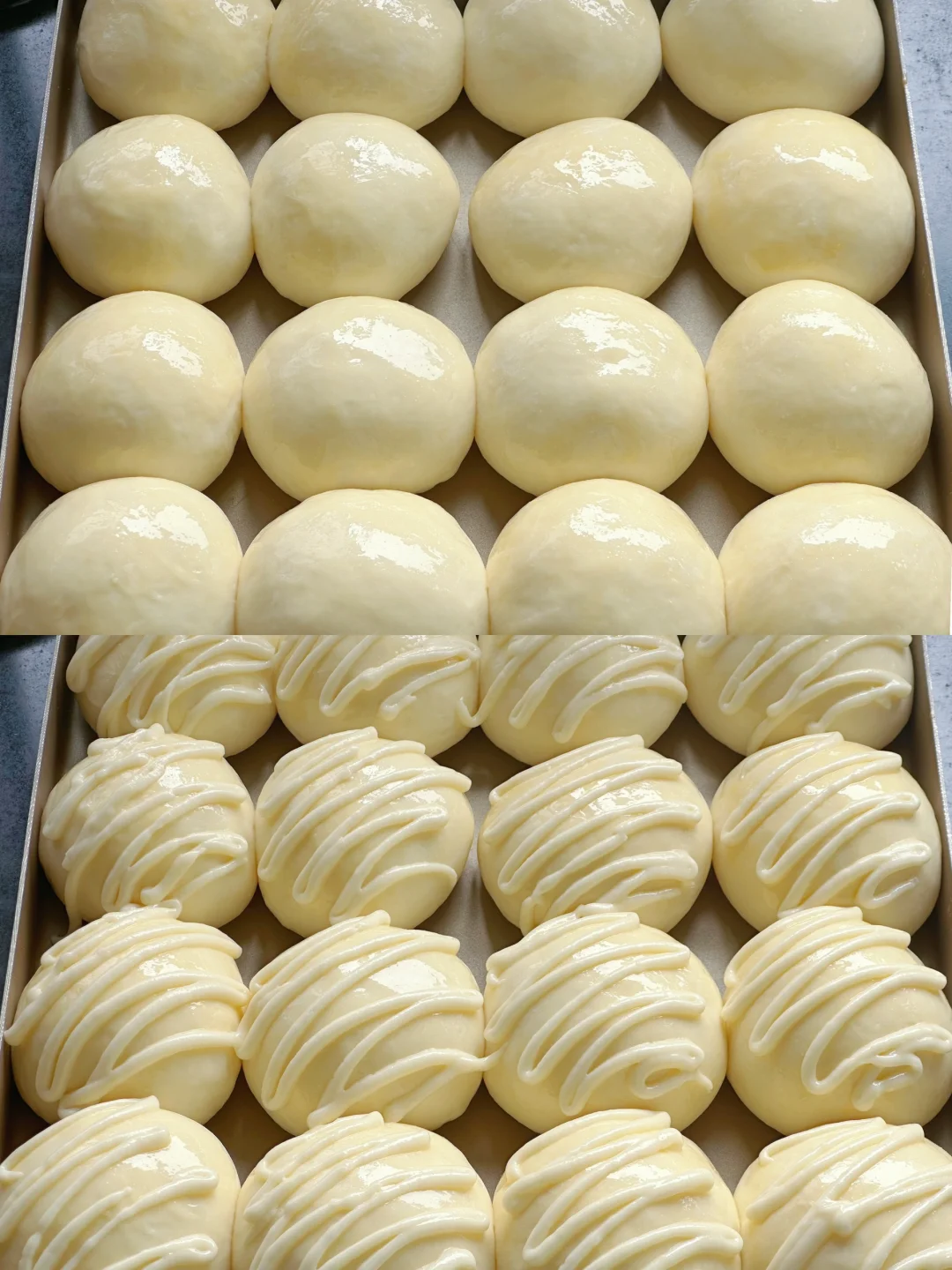 4️⃣取出发酵好的面团,按压排气,将面团均分成16个面团,滚圆,放入烤盘中,全部做完再放入发酵箱,温度32°C~35%左右,湿度75%-85%发酵至1.5倍大。