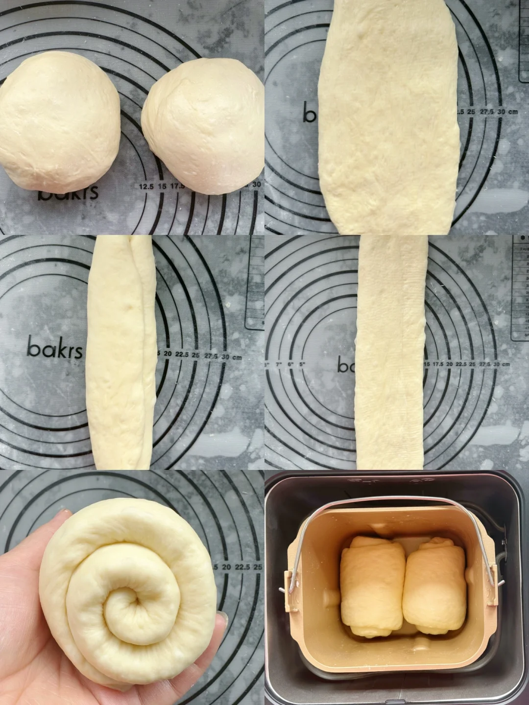 3⃣️揉出手套膜的时候取出整形,将面团分成两份,擀成牛舌状,翻苗,分别自左边和右边向中间1/3处折叠,用擀面杖稍稍擀长,从上至下卷起。