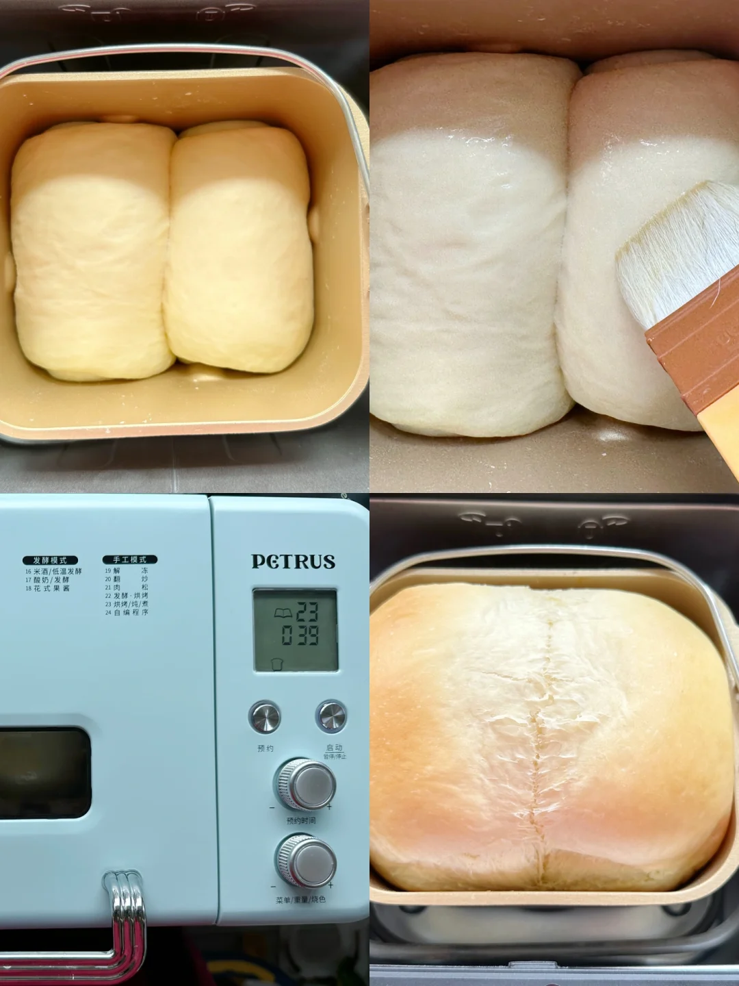 我为了省时只发了一次,所以发酵好以后,我直接选了菜单23烘烤模式!这款面包机这点就会比较方便~而且中途都可以暂停,夏天揉面温度高了可以暂停取出面包桶放冰箱冷冻降温!