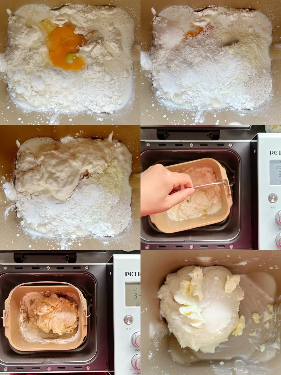 2️⃣将主面团中除黄油以外的所有食材包括波兰种放入柏翠 面包机桶内,先选择菜单4和风软面包模式,中途揉至能扯出厚膜的时候加入软化的黄油。(天气热,揉面过程需要控制面温,在醒面的时间可以盖保鲜膜放进冰箱冷栋一会儿。)