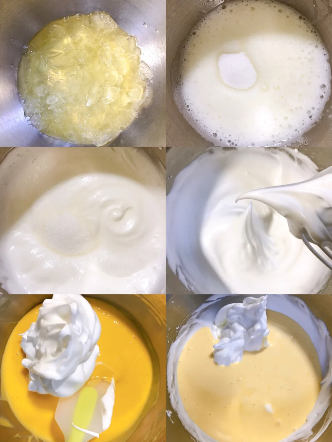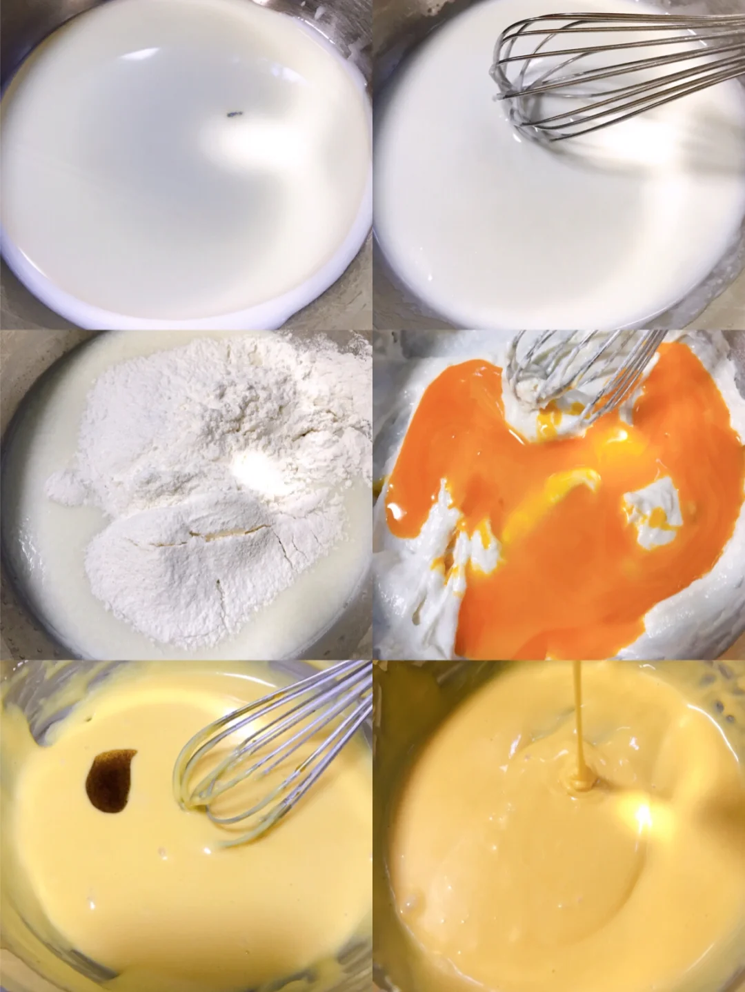 蛋黄40g,蛋白70g,牛奶45g,玉米油25g,低筋粉45g,细砂糖35g,香草膏2g,柠檬汁(或白醋)几滴