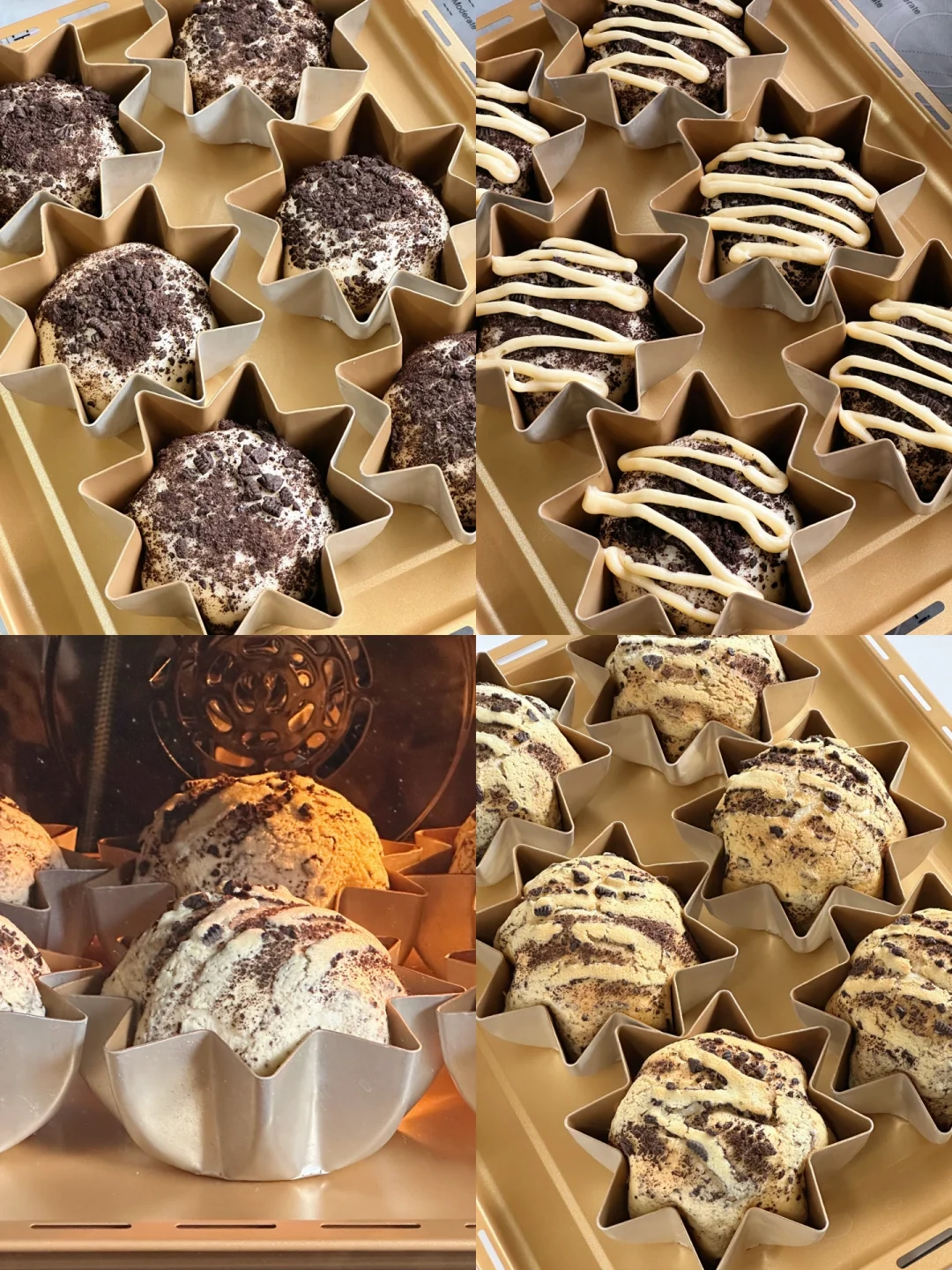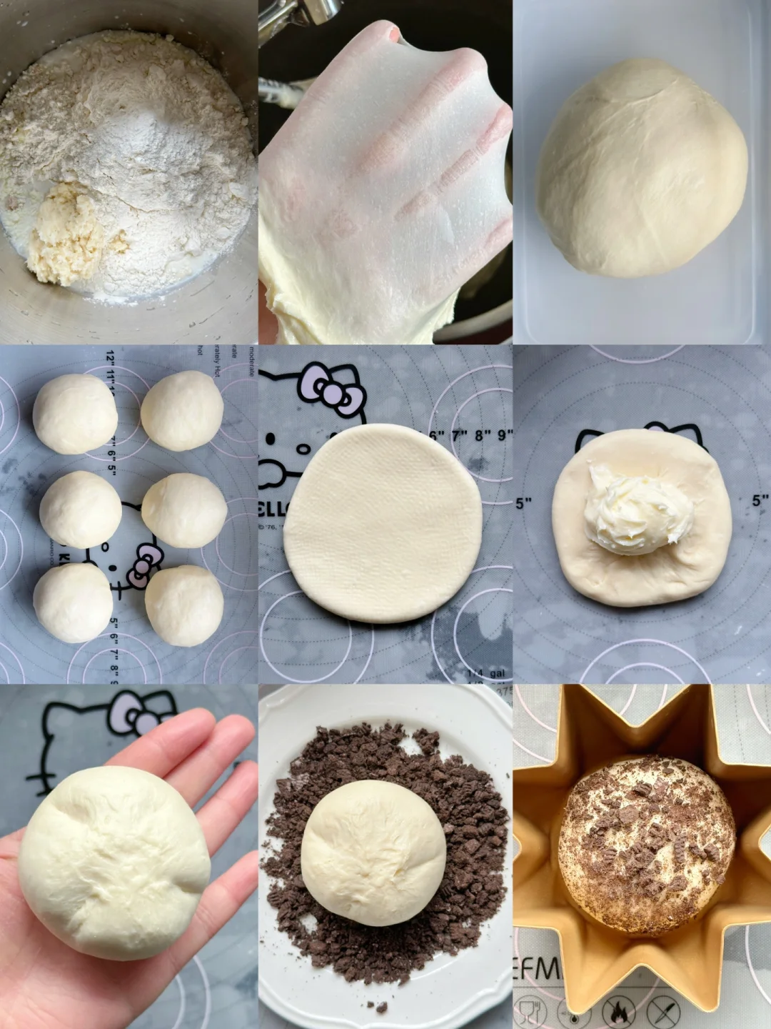 5️⃣取一个松弛好的面团擀成圆形面片,放入25克左右的馅,包好,收口捏紧,表面喷少许水,沾上奥利奥碎,放入模具