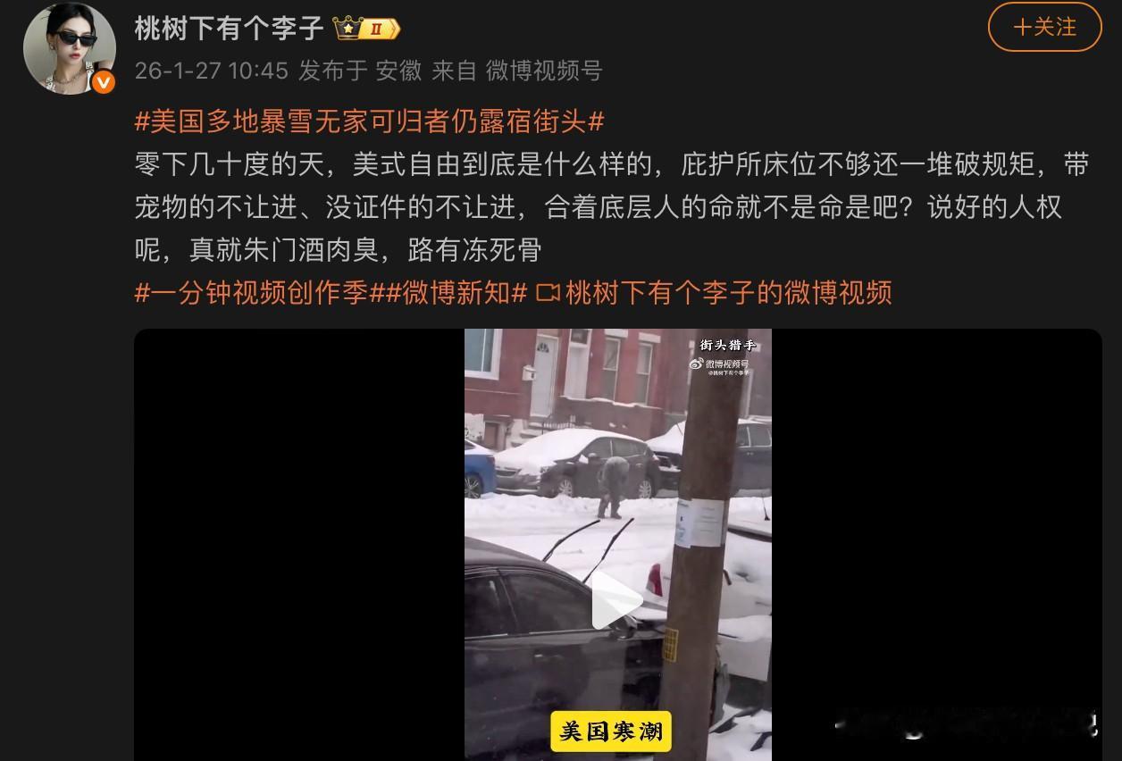美国这波寒潮与我国古代那句名言“朱门酒肉臭,路有冻死骨”跨时空共振了!这两天美国正在经历寒潮考验,据报道该寒潮已经导致数十人死亡。有网友拍到了部分现场视频,该视频迅速冲上热搜。只见有人在雪地里倒地不起、有的在路上做僵尸状低头摇摇欲坠、还有躲在纸壳子里面瑟瑟缩缩躲避风雪的。有好心人或者志愿者挨个给他们发放热饮,以期待给他们带去些许温暖,但面对天寒地冻的大环境,这无异于杯水车薪。我就纳闷儿了,按照某些人的说法,也就那么几十万无家可归者,那他们各地政府岂不是随随便便搭建一些板房帐篷,就能搞定。说实话,当我在看这段视频时真被震撼住了,吃人制度再度具象化了。这都9026年了,科技如此发达怎么还能有冻死骨的存在?