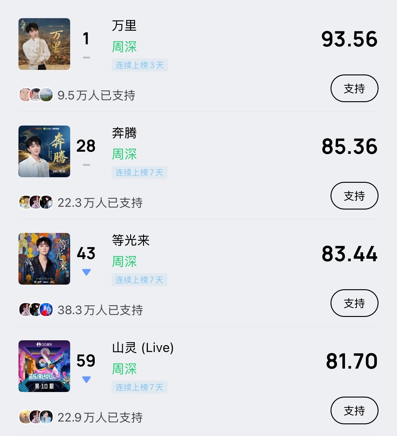 周深 📣 1.27 巅峰潮流 📣米米们下午好,每歌做6个动作路径:Q音-乐馆-排行-潮流巅峰✅《万里》✅《奔腾》✅《等光来》✅《山灵(live)》完成『支持』让更多人听到深深