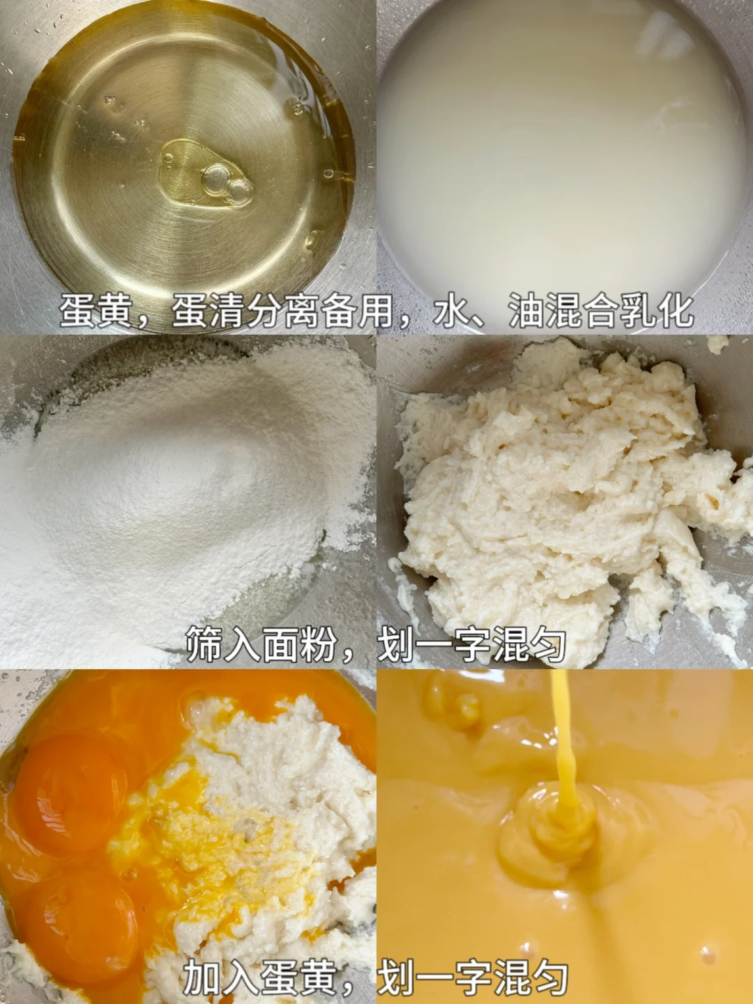 鸡蛋4个,水65g,玉米油50g,细砂糖50g,低粉85g,柠檬汁(或白醋) 几滴