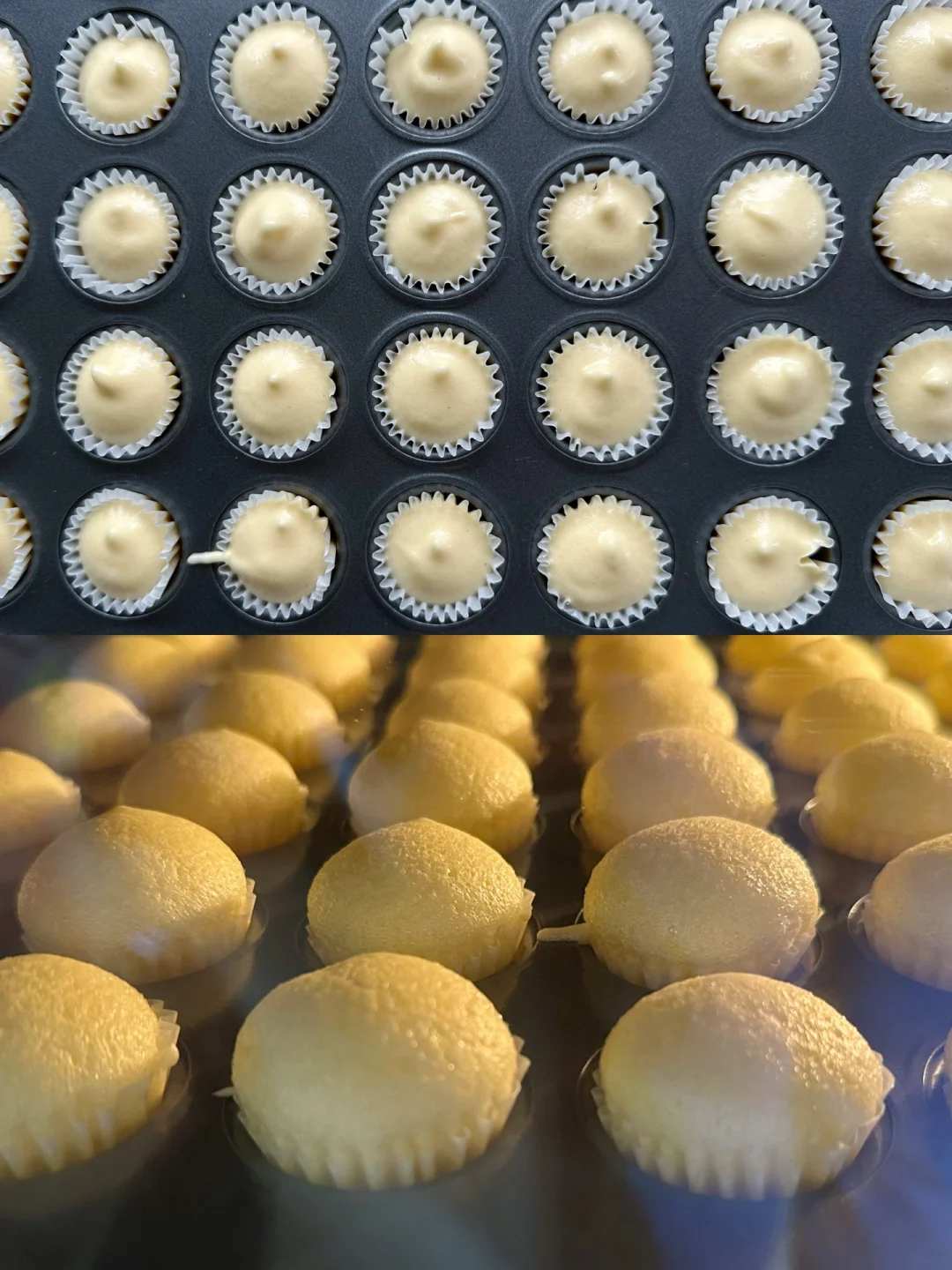 💞将混合好的面糊倒入裱花袋中,裱花袋剪一个口子,将面糊挤入纸杯,挤至八九分满。(面糊太少了烤出来不圆润饱满,太满了会开裂)
