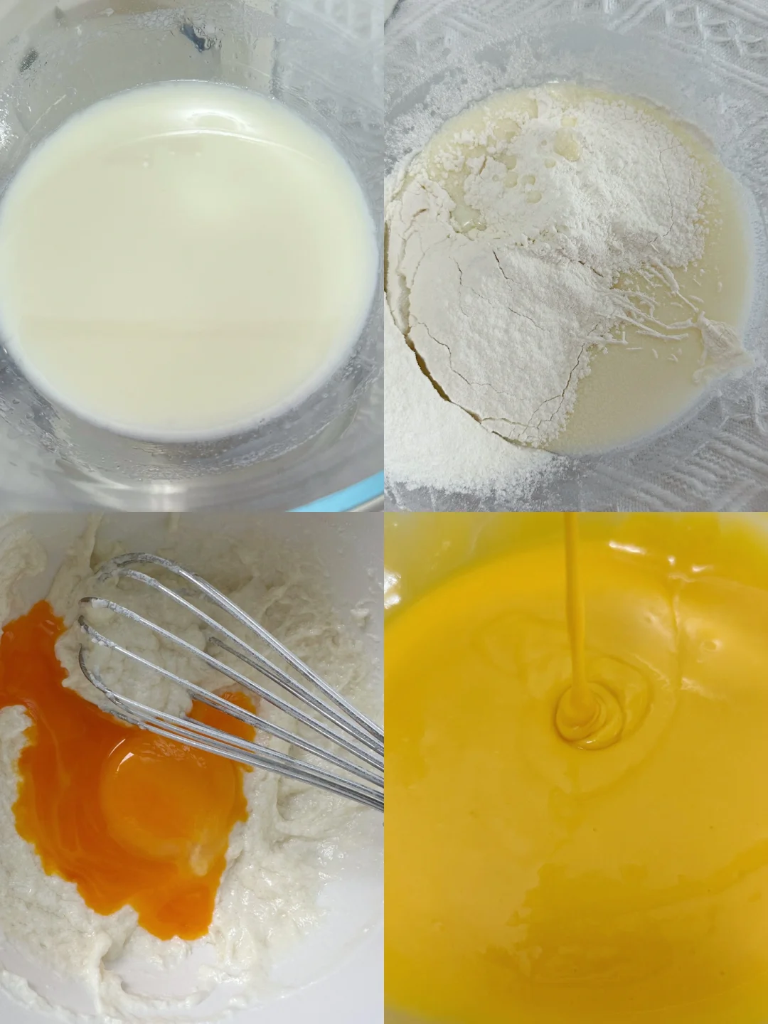 💞将牛奶、玉米油画圈搅拌至完全乳化。筛入低筋面粉,画一字或Z字混匀。