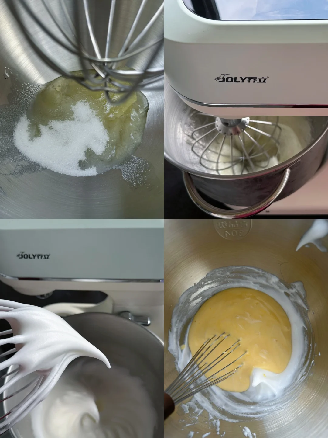 蛋黄40g,蛋白70g,牛奶45g,玉米油25g,低粉45g,细砂糖35g,柠檬汁(或白醋)几滴