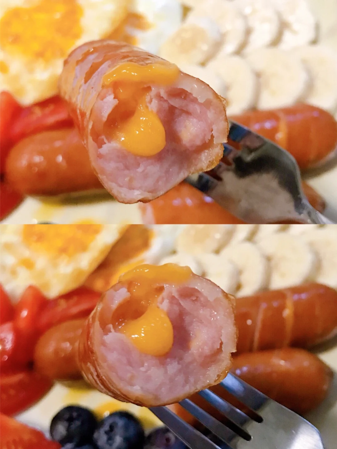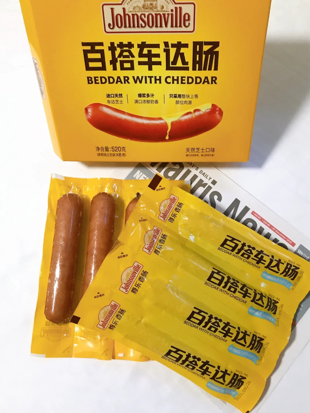 这款肠采用的是上等鲜腿部猪肉,整块鲜肉,吃起来Q弹多汁~而且里面加有车达奶酪,吃起来也是口口爆浆,甚至在煎的时候都会爆浆‼️