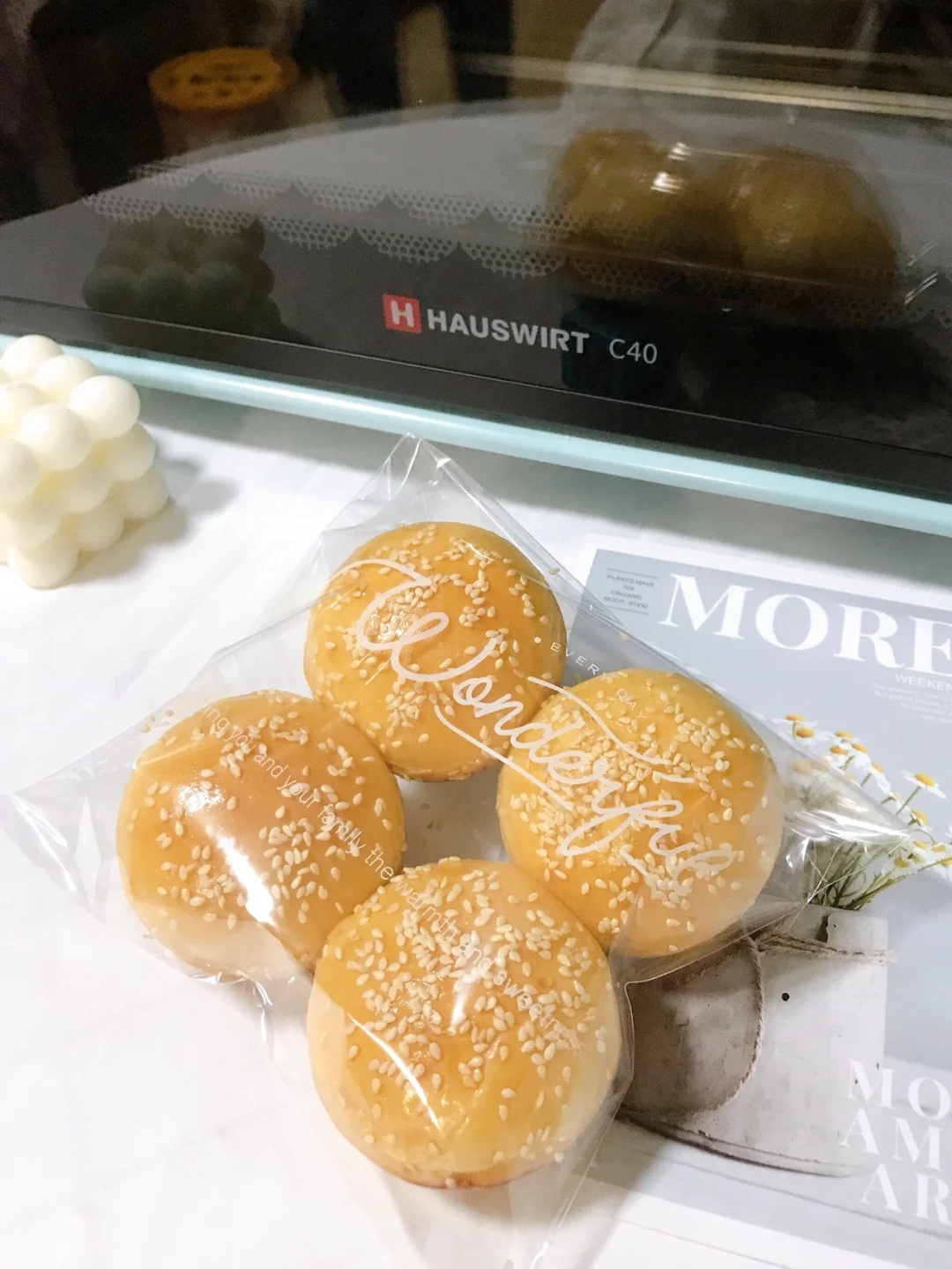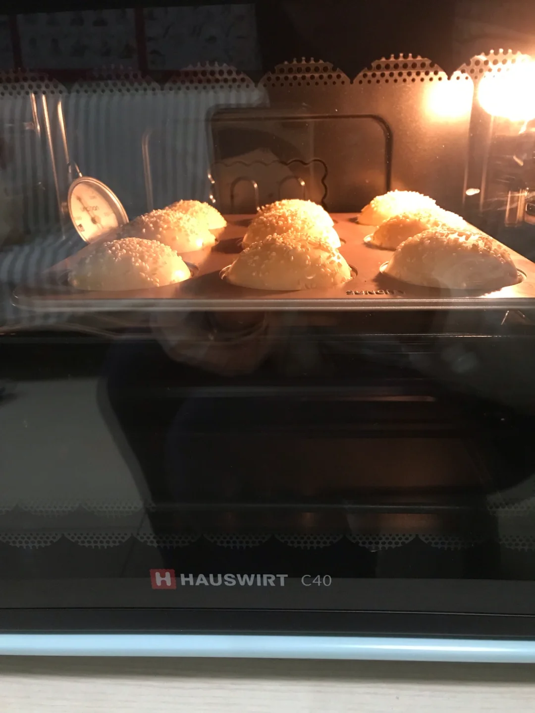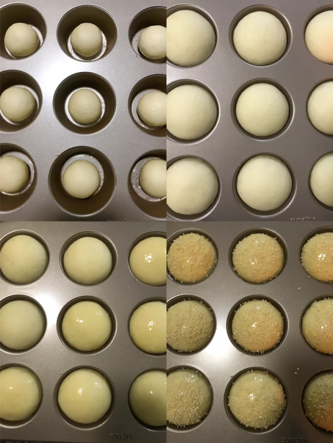 🐾全部做,好后,放入发酵箱温度32-35度,湿度70-80度进行二次发酵,时间大约40分钟。发酵至近满模,刷蛋液,撒上芝麻装饰。
