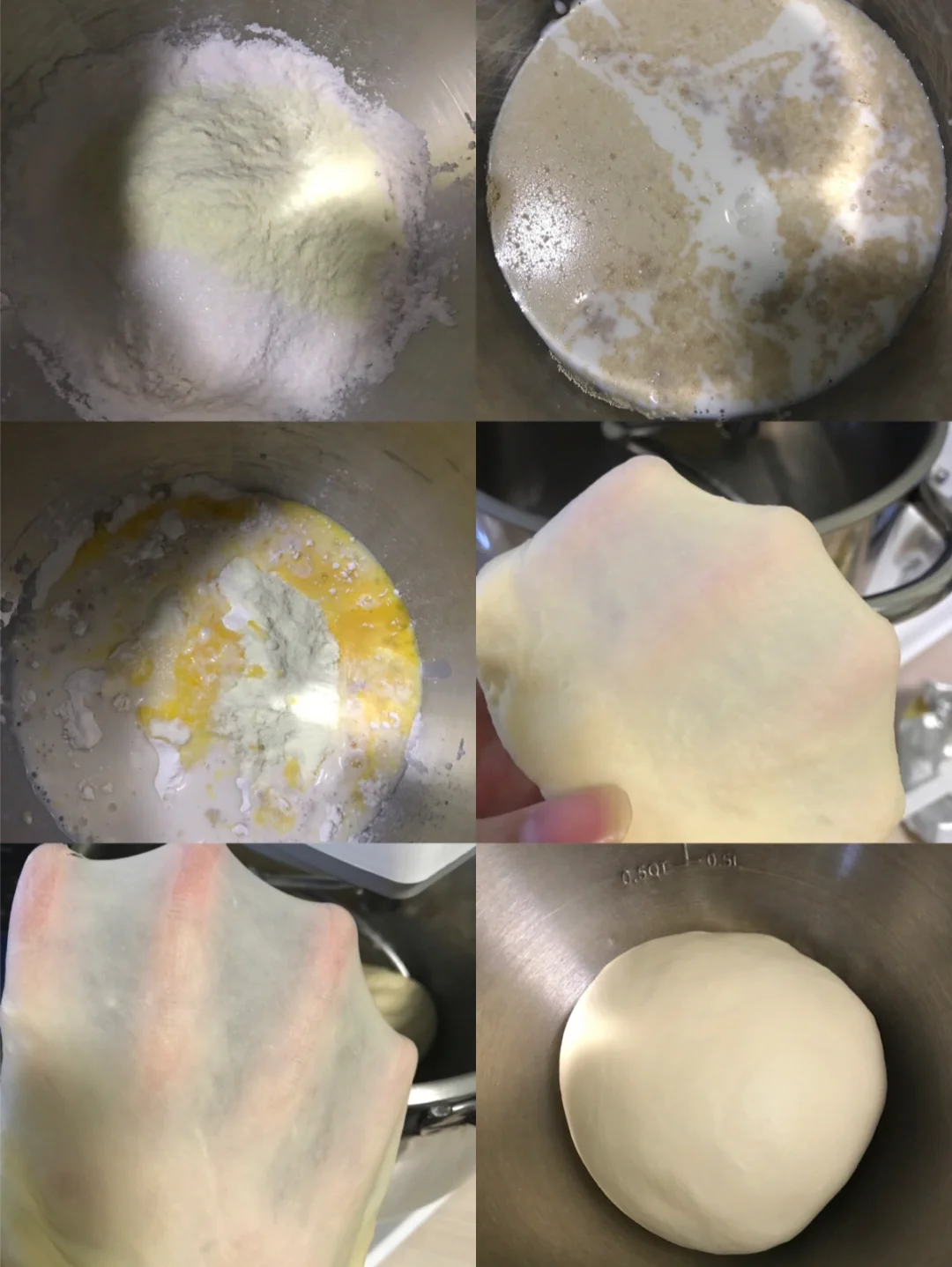 🐾除黄油、盐以外的所有食材放入厨师机桶内,开低速混匀成团,再开高速打出厚膜。加入软化好的黄油、盐,揉至完全拓展阶段,能扯出薄膜即可。(做小面包也可以不用揉到手套膜的)