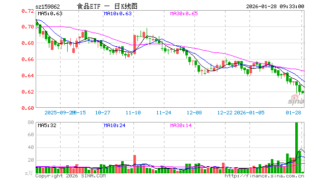 1月28日,食品ETF(159862)开盘涨0.16%,报0.620元。食品ETF(159862)重仓股方面,贵州茅台开盘涨0.00%,五粮液涨0.01%,伊利股份涨0.23%,泸州老窖跌0.32%,山西汾酒跌0.22%,海天味业涨0.08%,东鹏饮料跌0.08%,洋河股份跌0.28%,安琪酵母涨0.00%,今世缘跌0.25%。