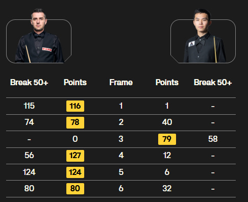 全场比赛,塞尔比轰出115、124两杆破百,以及3杆50+(74、56、80)。