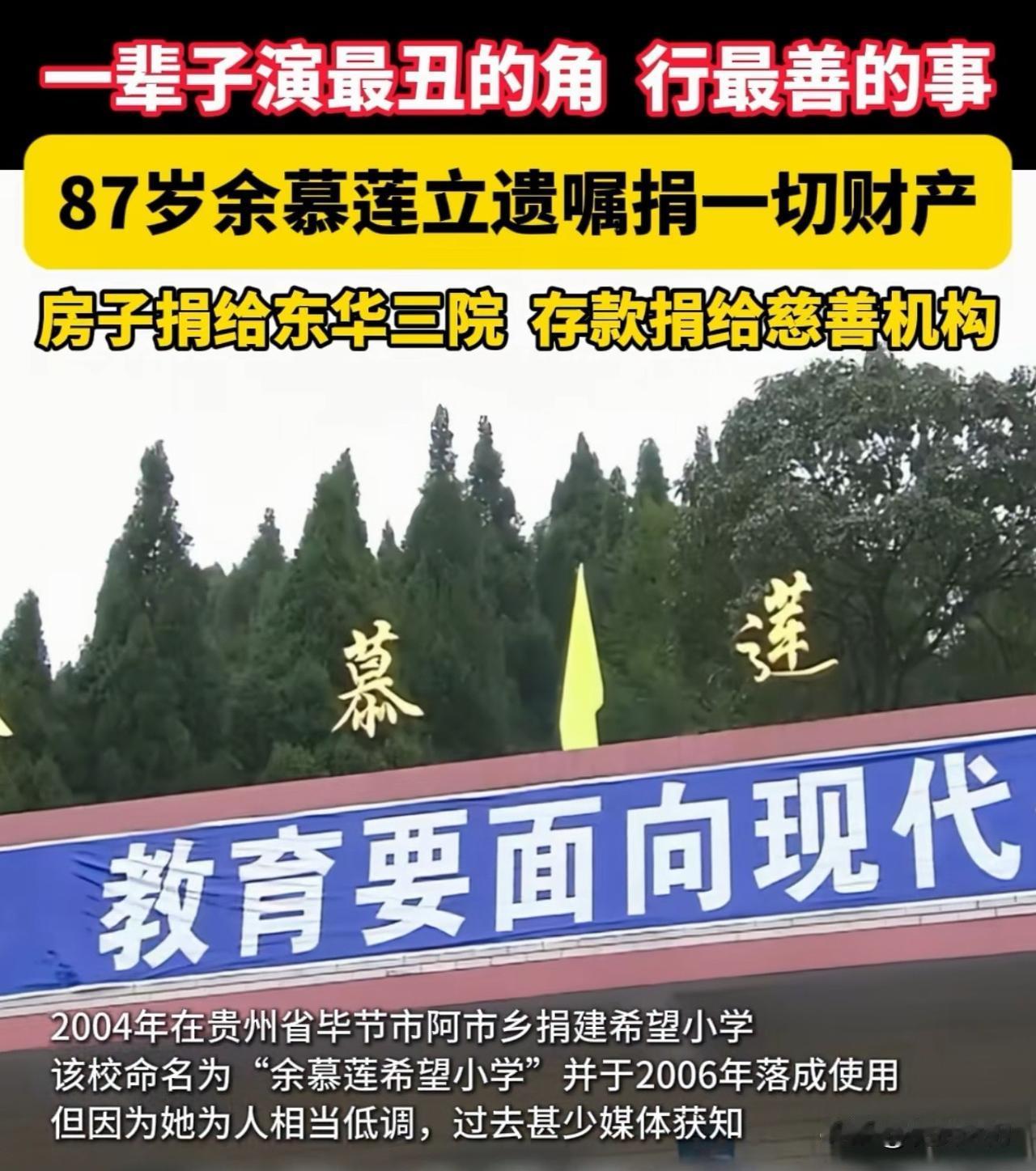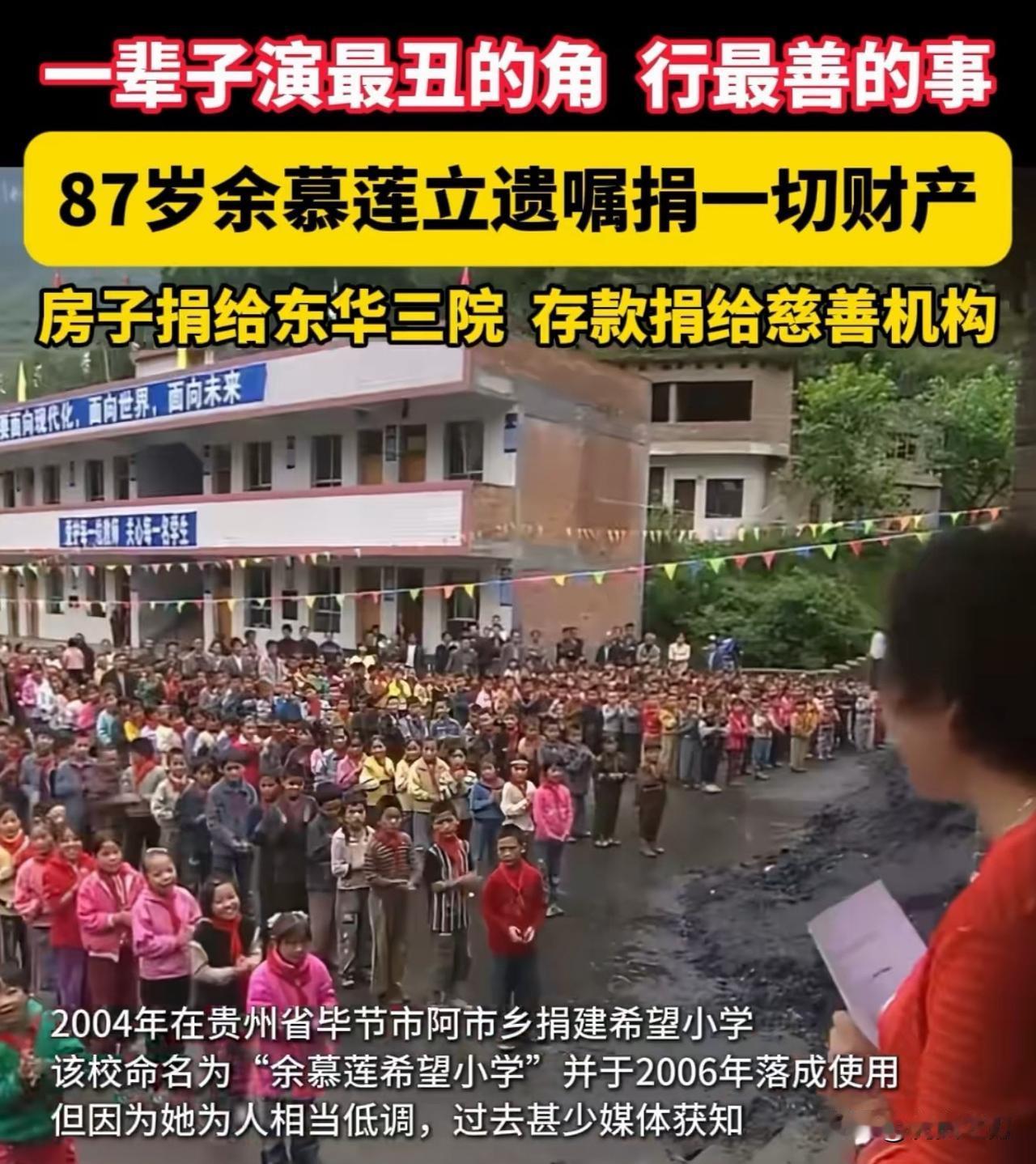 对这位老戏骨、疯婆子你还有印象吗? 一辈子演最丑的角,行最善的事, 目前住香港廉租房的88岁香港演员余慕莲一生节俭,一生老处女,最近在好友米雪和安德尊的见证下,签署了最后一份捐赠文件。她把名下的房产和全部积蓄近千万悉数捐出,一分未留。 她用实际行动颠覆了娱乐圈规则,给名利场好好上了一课。 图片:捐赠贵州毕节余慕莲希望小学现场