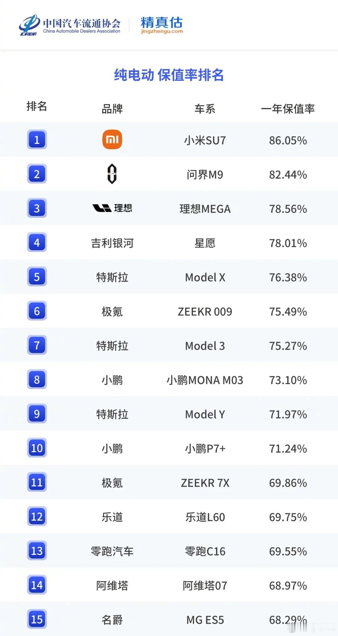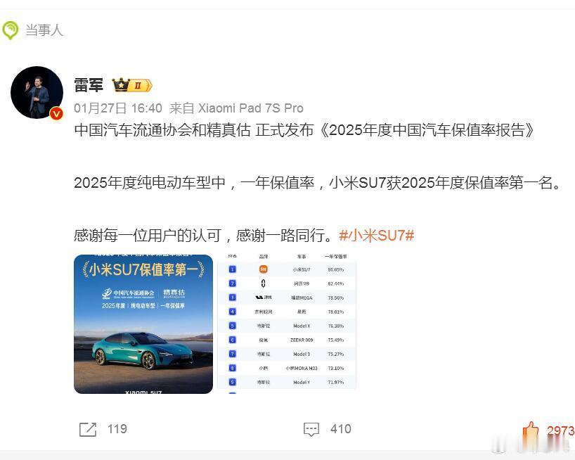 这次应该是官方权威发布的数据了,一年保值率在86%以上,比后面几个拉开的差距更大,算得上真正意义上的“遥遥领先”。保值率高说明一个问题,那就是不愁销路,出二手也能很快卖掉,所以价格就坚挺,这应该是一个很基本的逻辑。讲真,以前大家总说特斯拉是那个“口碑没赢过、销量没输过”的品牌,现在小米也能跻身这个行列了。雷军回应小米SU7保值率第一名新能源车小米SU7[超话]正能量