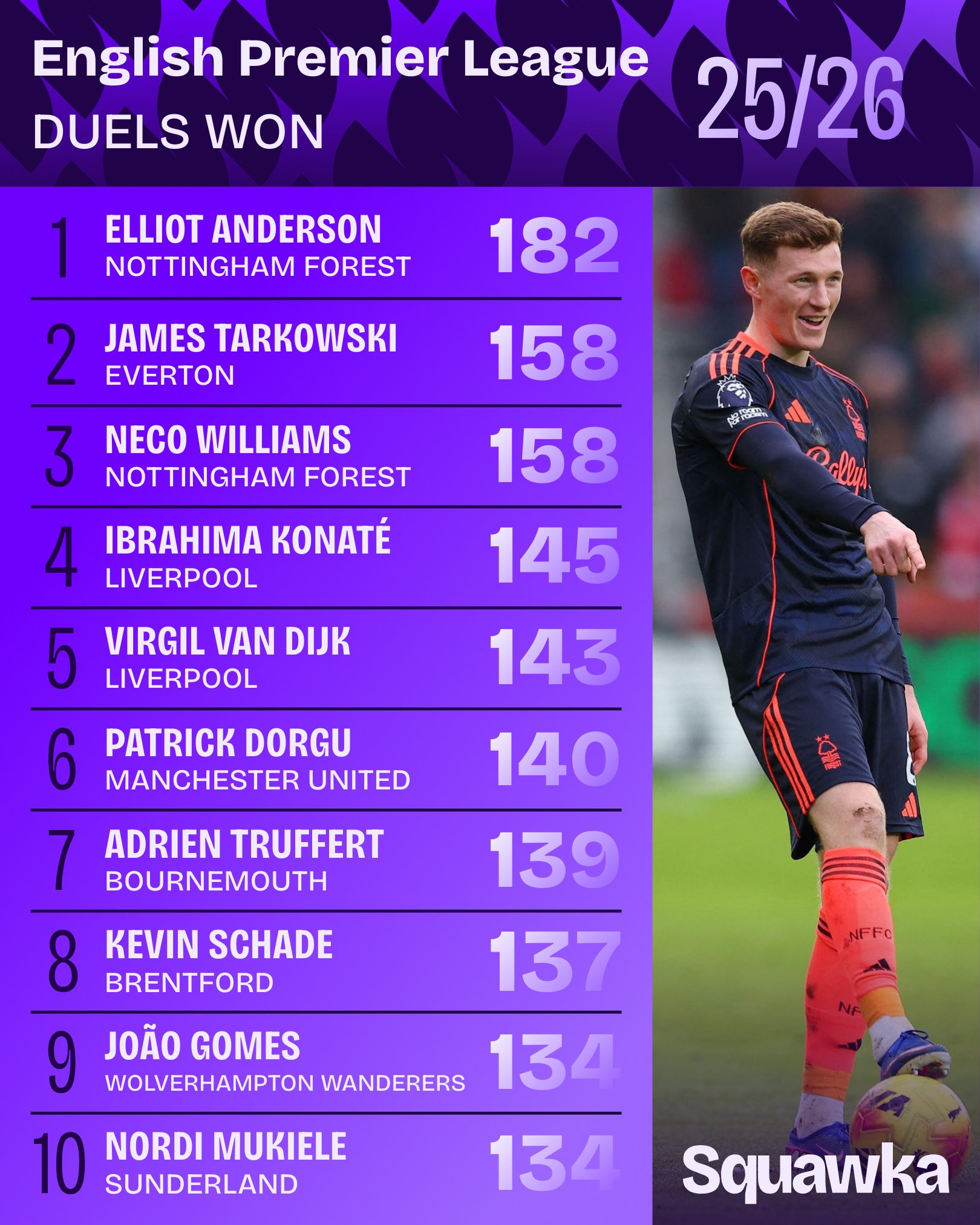虎扑01月28日讯据著名统计机构Squawka的数据显示,诺丁汉森林中场埃利奥特-安德森是本赛季对抗成功次数最多的球员,利物浦双中卫科纳特和范戴克位列第四第五位。