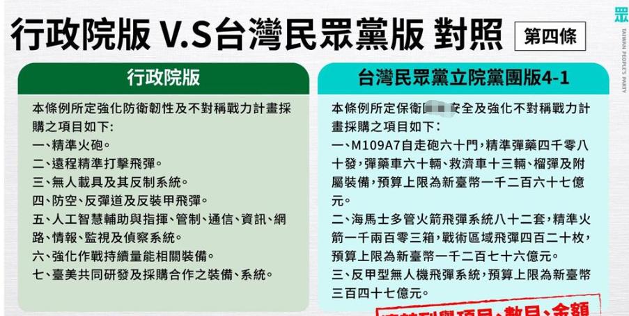 1.25兆军购预算遭十度封杀 蓝白联手破局 国民党拟推自提版跟进 2026年1月28日—— 台当局行政机构提出的1.25兆新台币“防务特别预算”案,昨日在“立院程序委员会”再度遭遇滑铁卢。国民党与民众党团凭借人数优势,联手第十度封杀该预算案,使其无法排入本周五(30日)本会期最后一次院会的议程,宣告此案在本会期内“无望过关”。 随着僵局持续,政治攻防态势发生剧变。继民众党团上周推出“4000亿瘦身版”草案后,国民党团今日也证实,正研拟自提版本,预计在额度与执行期限上与民众党版有所差异,此举意味着在野阵营对民进党当局的“天价军购”已从单纯的“阻挡”转向“重构”。 军方忧心:民众党版“买椟还珠”恐难执行 针对民众党团提出的将预算从1.25兆砍至4000亿的“精准打击”版本,台“防务部门”今日表达高度忧虑。战规司长黄文启指出,民众党版草案仅列出M109A7自走炮、海马士多管火箭等5项对美采购“硬体”,却未编列必要的“配合款”。 黄文启解释,以海马士系统为例,必须配套兴建战堡、车堡等后勤保修设施,“如果买了装备没地方放,可能造成损害”。他警告,若仅照单全收武器而不顾后勤、弹药库及维修工厂等建置,即便预算通过,、也将面临“无法执行”甚至“形成不了战力”的窘境。 蓝白联手挡驾 国民党拟推“第三势力”版本 面对军方的“技术性”劝退,民众党团并未退让,反批行政机构版是“由上而下的政治点菜”,缺乏战略思考且预算浮滥。民众党团更以自制潜舰“海鲲号”至今未进行潜航测试为例,质疑军方的“建军建言”本身就存在“窒碍难行”的问题。 国民党立委牛煦庭今日透露,国民党团原则上支持防务,但不能接受“空白支票”。他强调,国民党内部正在研拟自提版本,逻辑上会与民众党团类似,但在预算总额与分期执行的时间规划上会有落差。牛煦庭直言,若仅因美国施压就放弃审查的本质,是“自相矛盾”,社会不应接受“亲美”必须牺牲所有价值的意识形态。 民进党急寻出路 呼吁下会期优先审议 今日的“程序委员会”在蓝白联手下,顺利将议程草案提报至周五院会,意图在本会期结束前彻底冻结该预算。对此,民进党团干事长钟佳滨表示无奈,呼吁周五既是本会期最后一次院会,不论行政院版、民众党团版或未来的国民党团版,都应尽速交付委员会审查。 钟佳滨强调,下个会期将优先并案审议,试图为这笔巨额军购寻找出路。然而,随着蓝营也准备“另立炉灶”提出自提版本,加上民众党版的强力介入,原本单纯的“朝野对决”已演变为三方角力的复杂局面。赖清德当局原本期待的“1.25兆天价预算”,恐将在下会期面临更激烈的“削骨式”修改,能否保住原案规模已充满变数。