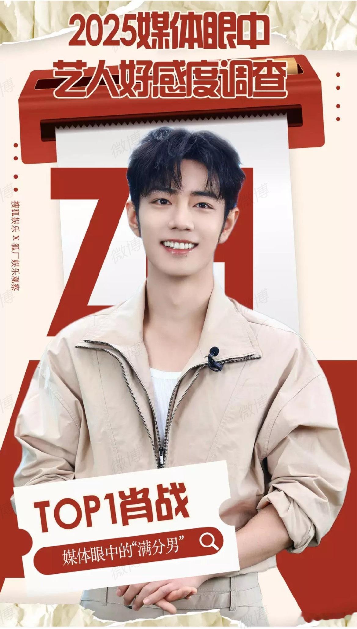 2025媒体好感艺人肖战、白鹿、王鹤棣、李兰迪、宋威龙。 肖战2025媒体好感艺人top1
