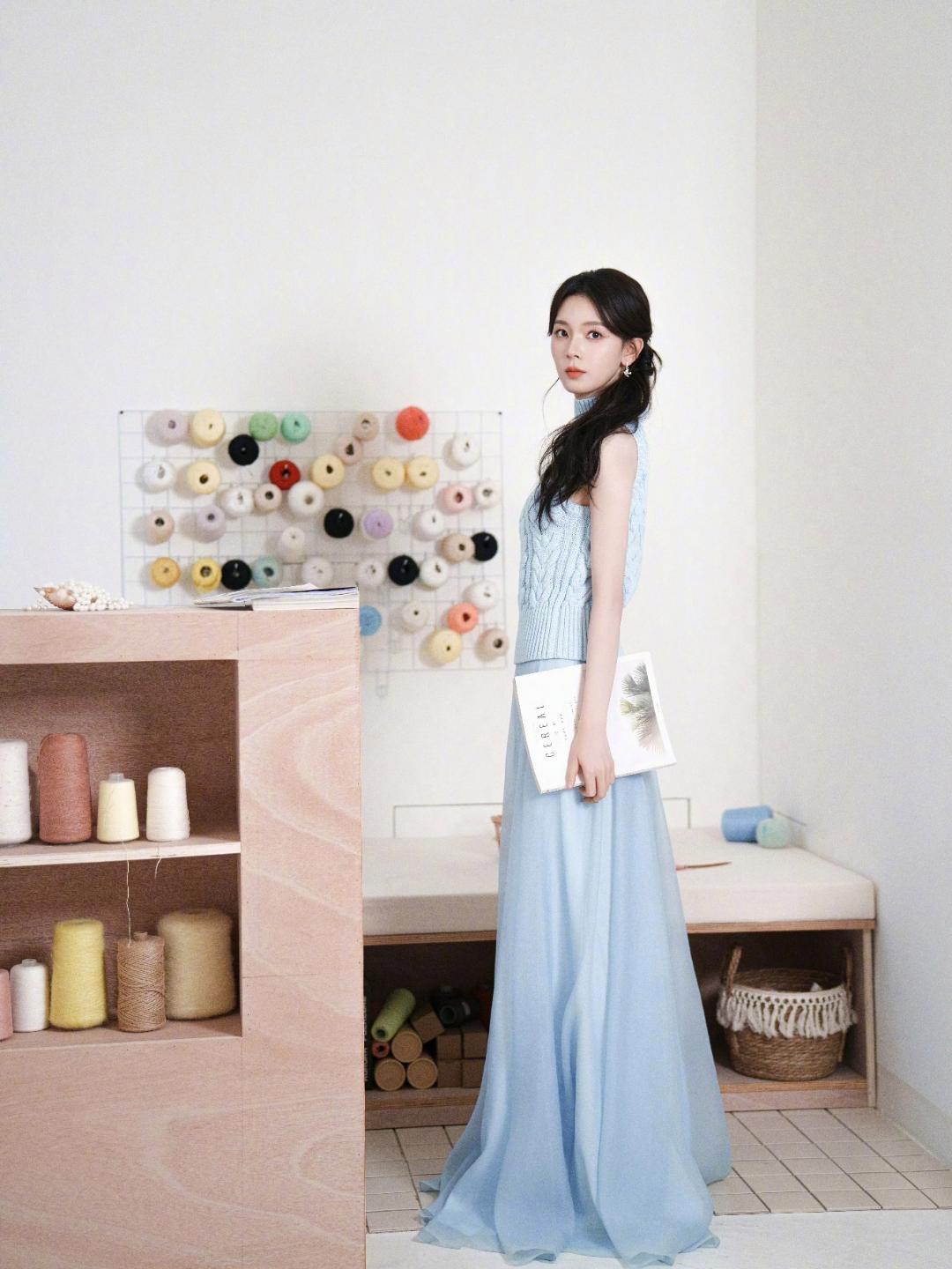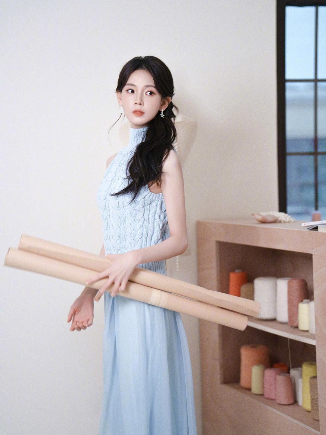 陈瑶的这组春日写真,用一身浅蓝针织拼接裙,把温柔松弛的氛围感拉满! 挂脖针织上衣自带复古肌理感,搭配飘逸的纱质长裙,轻盈又灵动。在充满毛线团与布料的工作室场景里,她时而摆弄珍珠饰品,时而倚着木梯浅笑,像春日里的一缕清风,清甜又治愈。