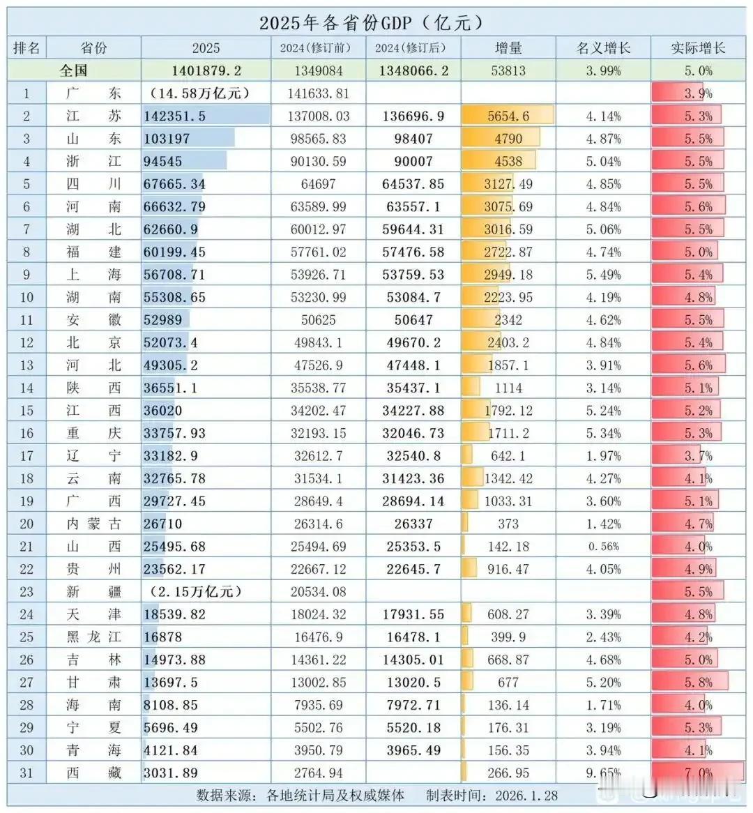 江苏2025年GDP压轴公布!总量高达14.23亿,与广东的14.58亿只差3500亿了。如果未来两三年广东还不找回状态,江苏超越广东已经是近在咫尺了! 苏大强增量全国第一,高达5654.6亿!而广东增量只有4000多亿,江苏每年将差距缩小一千多亿。即便是龟兔赛跑,也能很快超过广东了。粤老大压力不小哦! 2025gdp 各省GDP排行 江苏gdp排名
