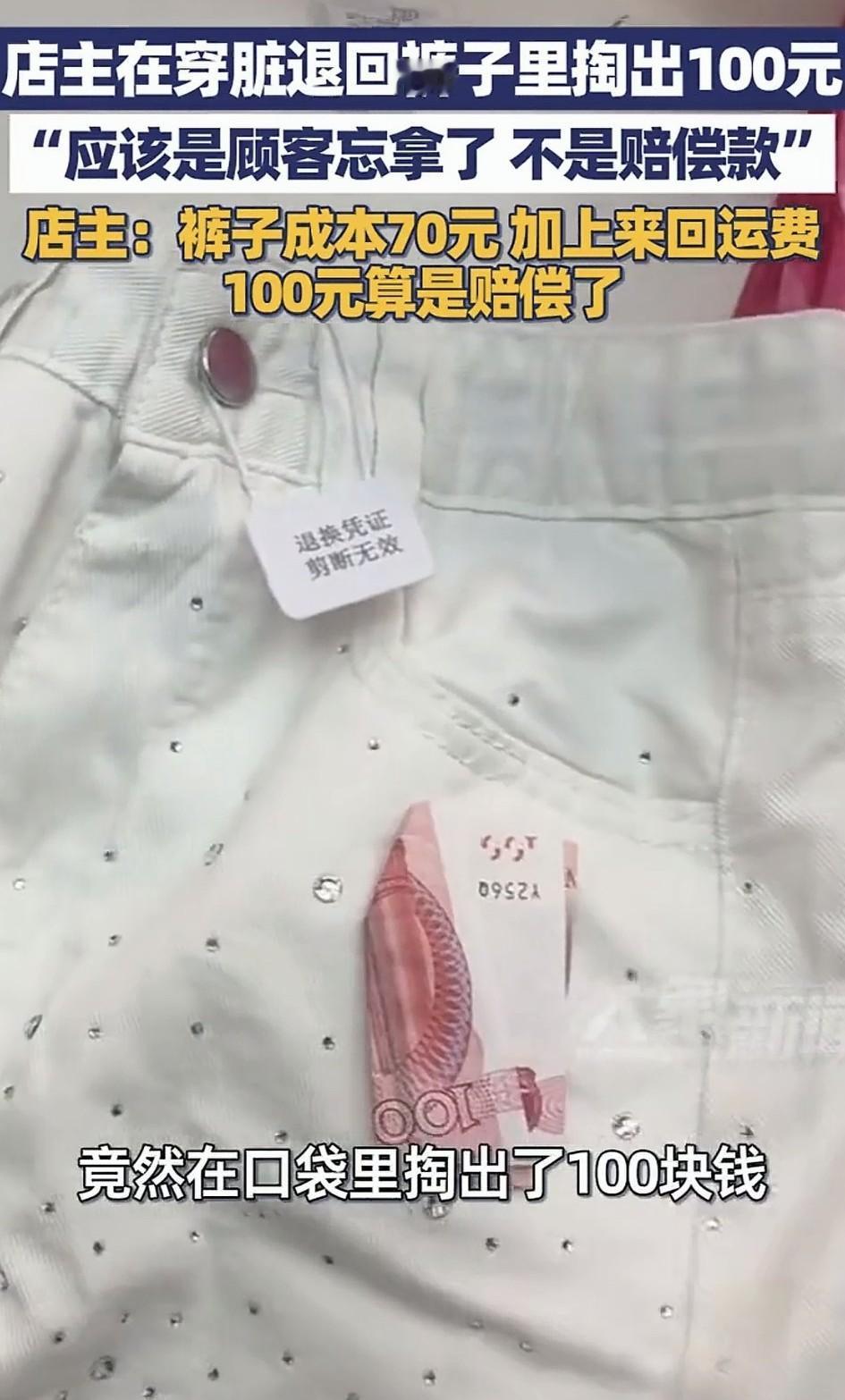 大意了吧!广东东莞,一电商店主发视频称,一顾客在其店铺买了条裤子,不久后顾客又将裤子退货了,可店主收到裤子发现,这顾客是将裤子穿脏后才退回的。本是很生气的店主,却在整理这条裤子时,发现裤包里既有100元现金,瞬间店主心情舒畅了许多。 原来,店主收到裤子时就很生气,因为这白白净净的裤子,退回来时已经很脏了,这明显就是顾客穿脏后再退回的。可让店主没有想到的是,刚准备要骂这不道德行为,却顺手在这裤子口袋里摸出了100块钱现金。 店主表示,这款裤子一次退款有很多件,所以这装钱的裤子也不知是哪位顾客的,也没有办法寻找。不过正好,这条裤子成本大概70元,加上来回运费,这100元差不多追回了损失赔偿,事后也就不计较了。 对此有网友就表示:这就是偷鸡不成,反蚀把米。不过,好像所有人都挺店主感到开心了。 还有网友表示:虽然我不富裕,但网购多年,收到货物不合适不理想,我都会原封不动的退回去,从未想过穿了再退。这下好了,老天有眼,冥冥之中让顾客赔偿100元!笑不活了。 不得不说,顾客千算万算也没算到这一出吧,本想占个小便宜,结果却大意了。正好这100块抵销赔付,就无需退回了。当然,此事说明一个道理,千万不可昧着良心贪图小便宜,做人做事更要本本分分,否则以小失大,那可就得不偿失了!