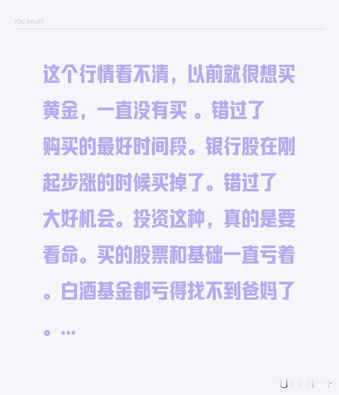 这个行情看不清,以前就很想买黄金,一直没有买 。错过了购买的最好时间段。 银行股在刚起步涨的时候买掉了。错过了大好机会。 投资这种,真的是要看命。买的股票和基础一直亏着。白酒基金都亏得找不到爸妈了。 时也命也。 人生如梦,梦如人生。 黄金价格暴涨暴跌 是走还是留