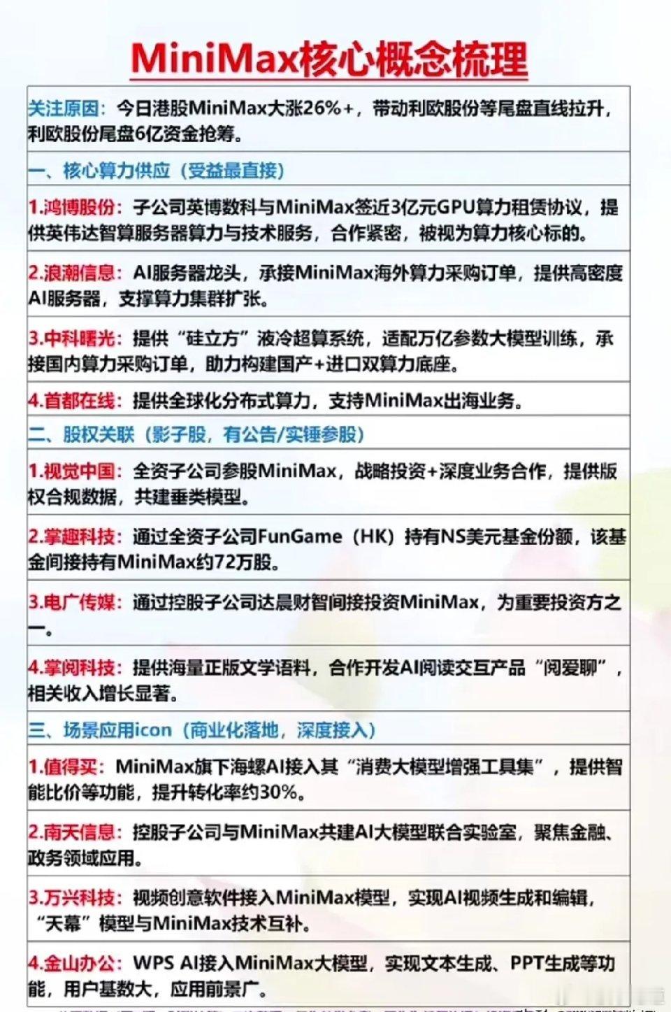 MiniMax港股暴涨26%+引爆A股算力行情!利欧股份尾盘6亿资金疯抢,这条产业链全梳理来了,拒绝杂毛AI应用核心龙头梳理!MiniMax是国内快速崛起的AI大模型公司,旗下的「海螺AI」等产品商业化落地进展迅速,其合作伙伴关系公司有鸿博股份、蓝色光标、浪潮信息等等。1月27日,DeepSeek发布V3.2-Exp与V3.2-Speciale两款模型并开源,2026年2月将推V4。相关概念龙头代表有每日互动、亚康股份、竞业达等等。豆包AI2026央视春晚独家AI合作伙伴,火山引擎+豆包深度参与创作、互动、分发全流程,国家级曝光催化商业化。相关概念龙头代表有润泽科技、中兴通讯等等。理财有风险入市需谨慎资料取材网络仅供参考不能作为投资依据!今日看盘股票