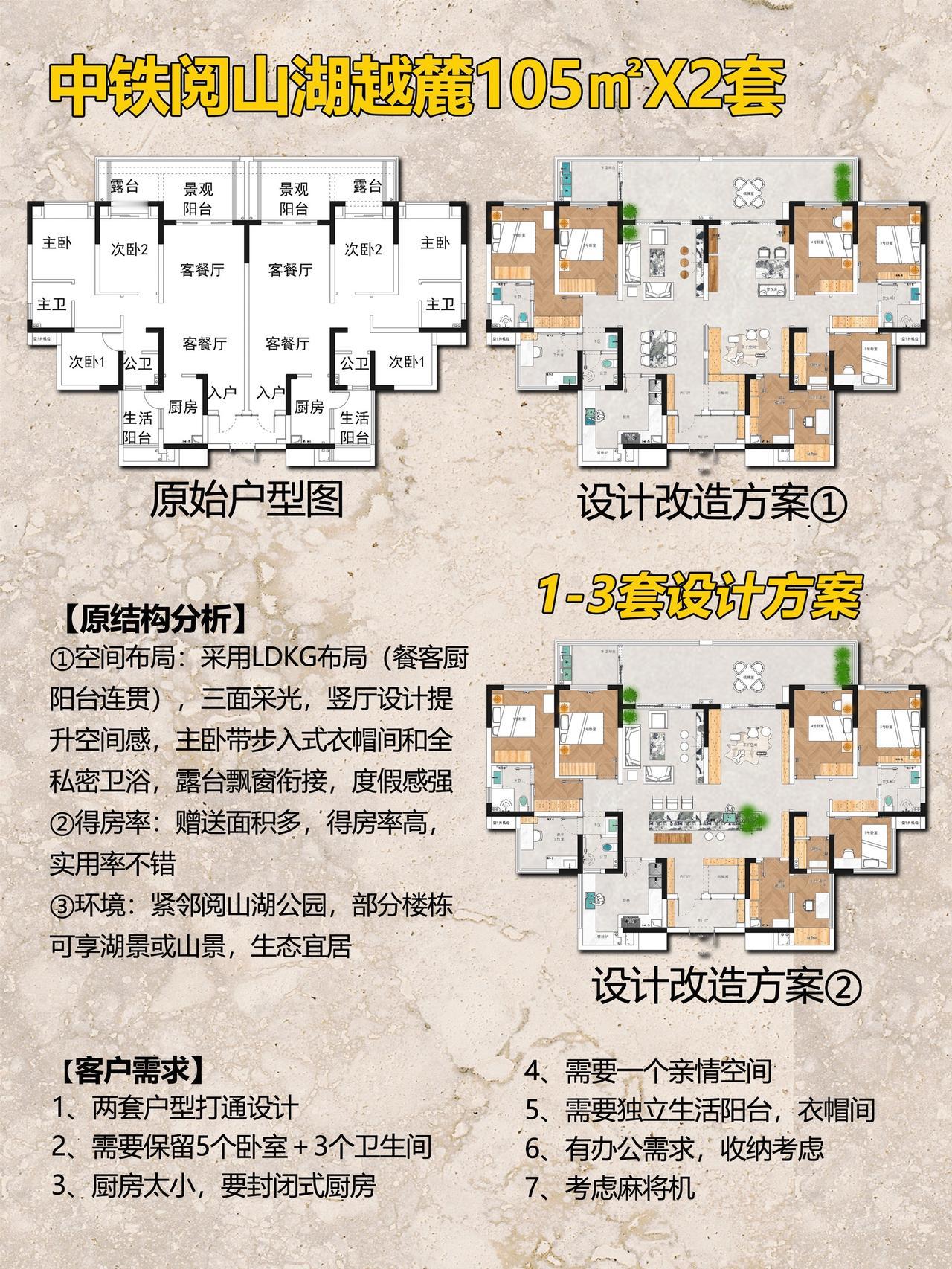 贵阳中铁阅山湖越麓105㎡两套打通装修!叮咚🔔装修打工人阿杰又上线啦❗️ 今天分享一套特殊的设计案例,中铁阅山湖越麓组团105户型,两套打通装修✨ 项目信息📋 📍楼盘:中铁阅山湖越麓组团 🏠户型:平层(三室两厅一厨两卫)X2 📏面积:105㎡X2 🎨风格:中式风格 🏠【户型定位】 经典三居两厅两卫,功能齐全,动静分区合理。 🏡【原结构分析】 ①空间布局:采用LDKG布局(餐客厨阳台连贯),三面采光,竖厅设计提升空间感,主卧带步入式衣帽间和全私密卫浴,露台飘窗衔接,度假感强 ②得房率:赠送面积多,得房率高,实用率不错 ③环境:紧邻阅山湖公园,部分楼栋可享湖景或山景,生态宜居 📝【客情需求】 1、两套户型打通设计 2、需要保留5个卧室+3个卫生间 3、厨房太小,要封闭式厨房 4、需要一个亲情空间 5、需要独立生活阳台,衣帽间 6、有办公需求,收纳考虑 7、考虑麻将机 🙋【关于我】 一位充满热情、细心、靠谱的90后设计师。拥有别墅、洋房、跃层、大平层、普通住宅10年设计经验。为装修设计发愁的你排忧解难! ✅擅长风格 意式、新中式、现代简约、奶油风、宋式美学、中古风、法式风、现代轻奢等… 📄【个人案例】 中铁阅花溪|中铁逸都|中铁阅山湖|阅山湖云著|华润悦府|中海映山湖|茅台广场|美的林城|金融城|融创九樾府|中海印龙泉|华润九悦|龙湖天曜|龙湖湖山原著|万科鸣翠|万科麓山|铁建城|龙湖舜山府|远大美域|观山小区|建发和玺|保利公园 。。。。。。 贵阳装修 中铁阅山湖 中铁阅山湖越麓 中铁阅山湖臻藏