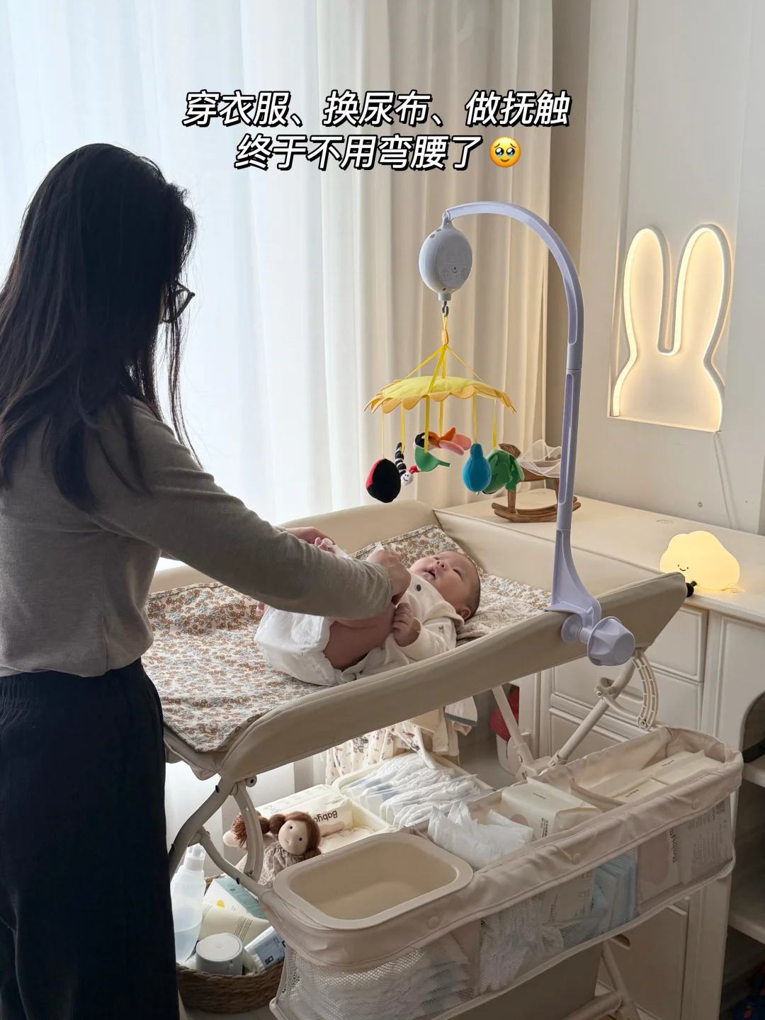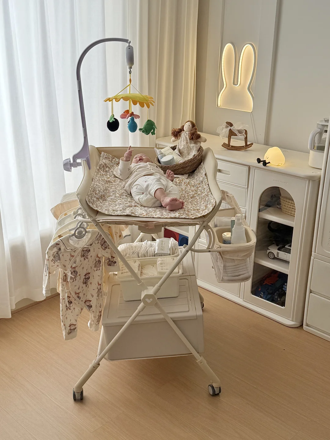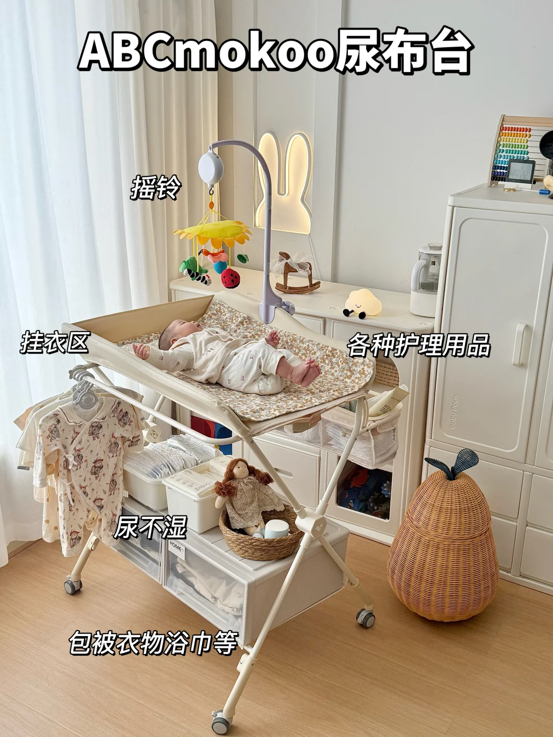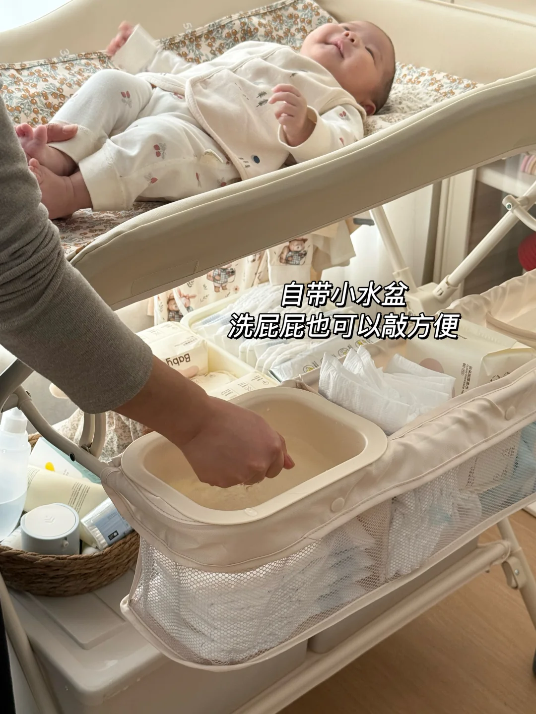 🧺 它还自带收纳空间,宝宝常用的尿不湿、湿巾、润肤露、小衣服,我都塞在旁边的挂篮里,随手就能拿到,卧室一下子整齐好多。