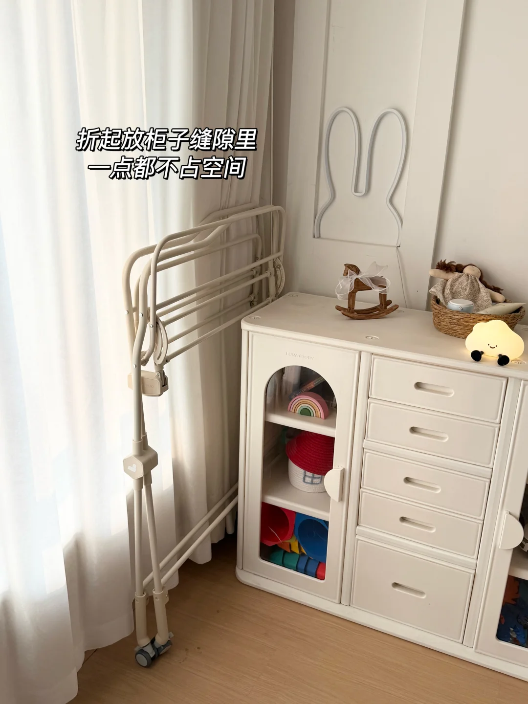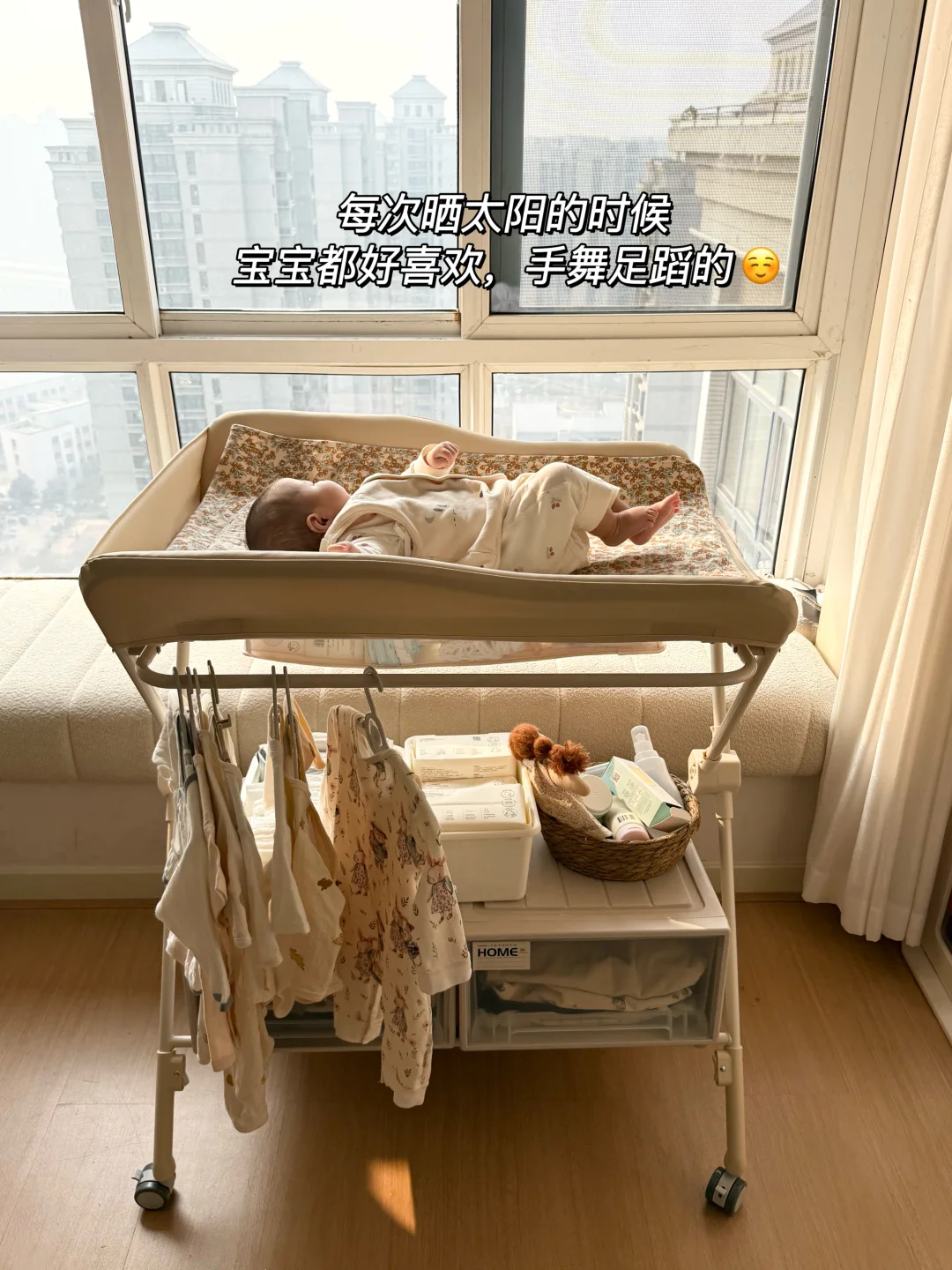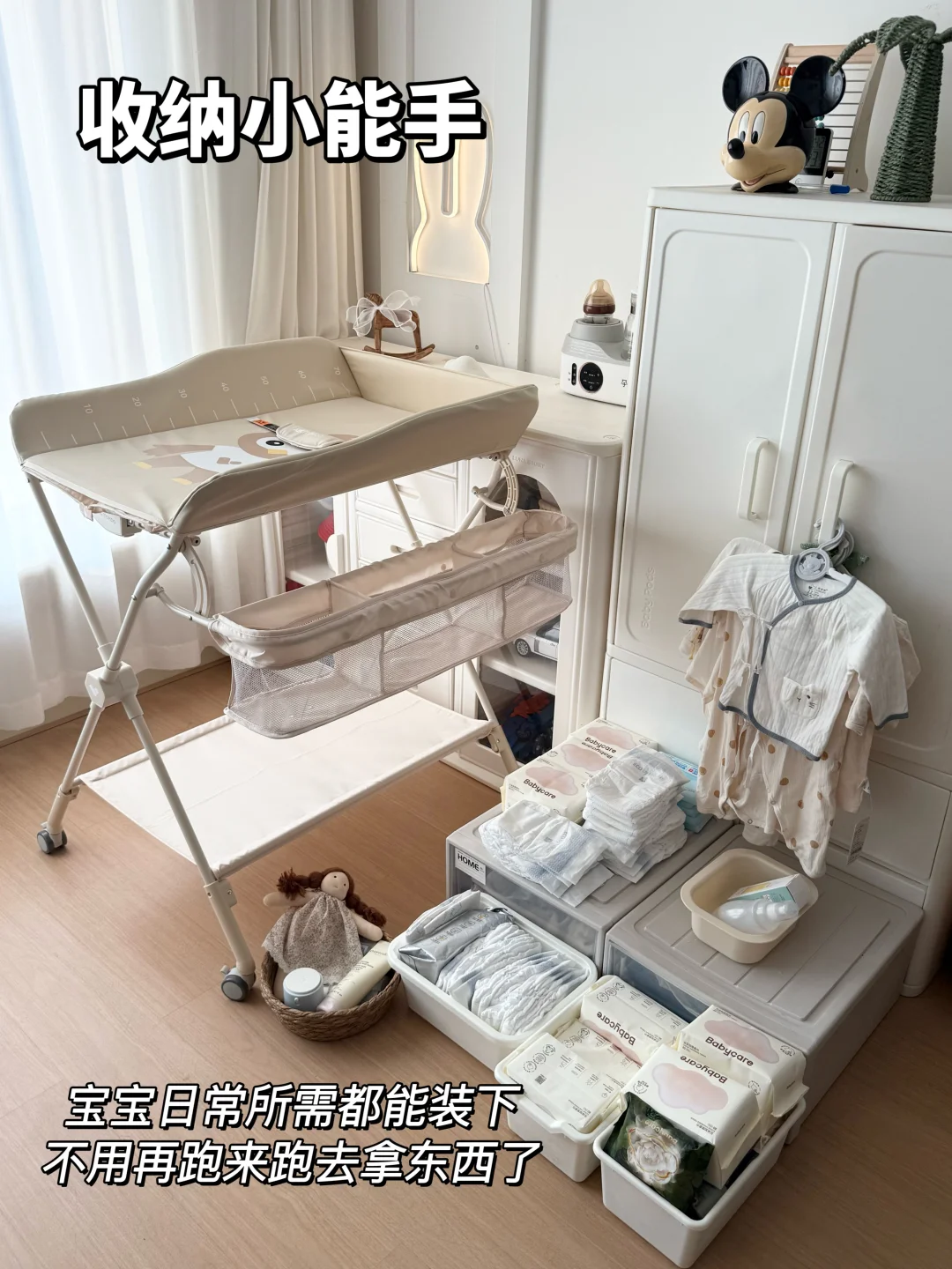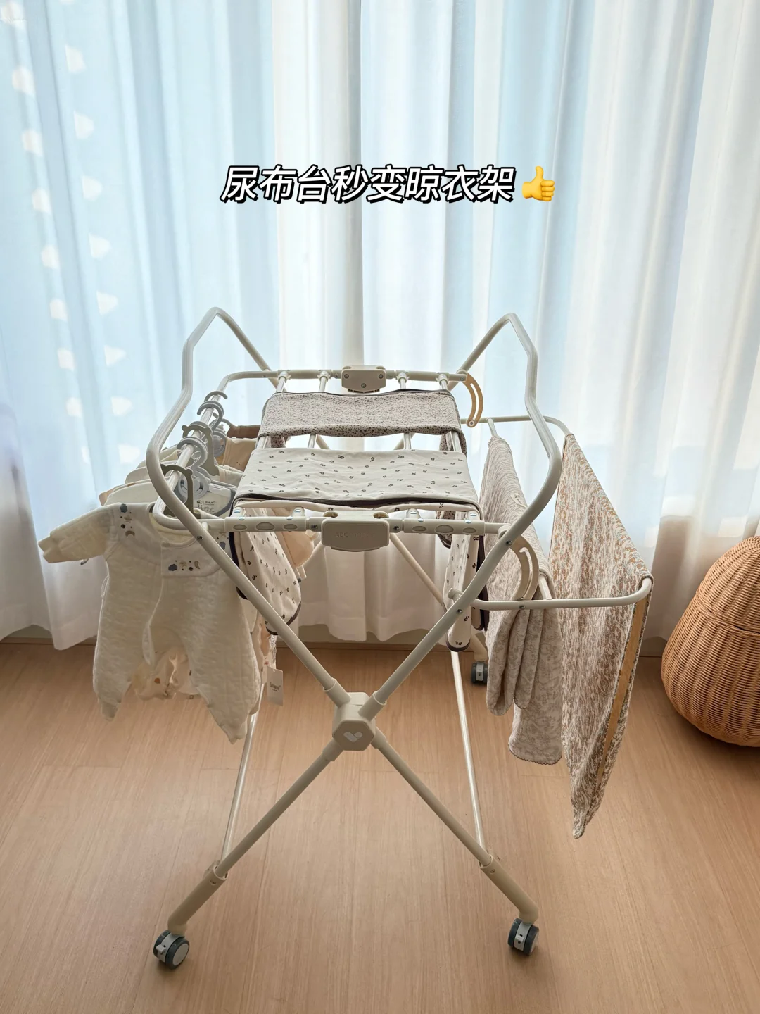 🧺 它还自带收纳空间,宝宝常用的尿不湿、湿巾、润肤露、小衣服,我都塞在旁边的挂篮里,随手就能拿到,卧室一下子整齐好多。