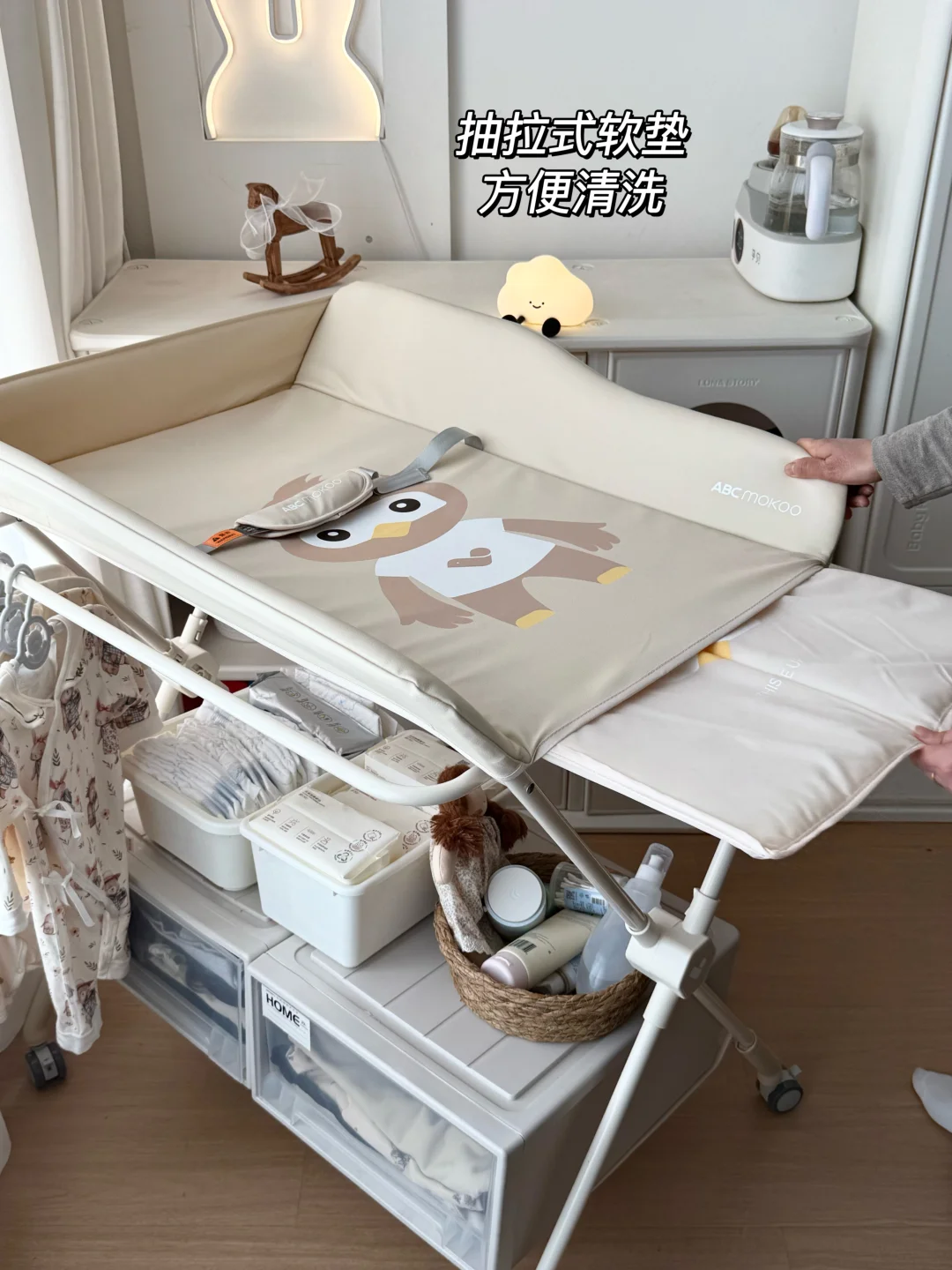 早上起来迷迷糊糊的,把娃放上去换尿布、做抚触,一套流程在尿布台就搞定,再也不用慌慌张张跑来跑去。