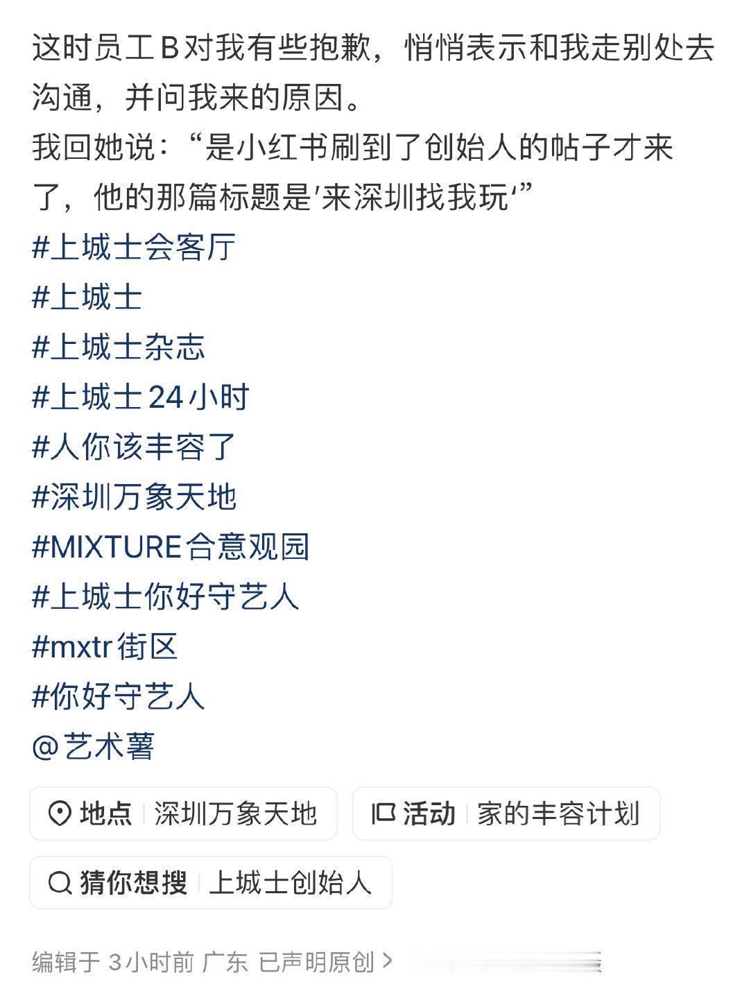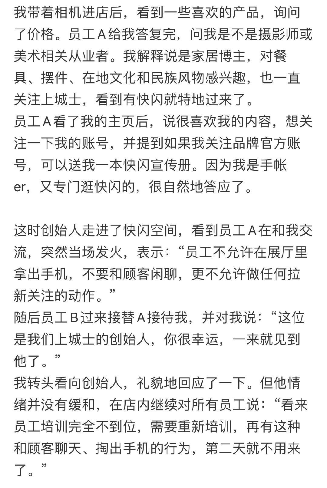家居博主曝上城士创始人不在乎顾客家居博主被上城士创始人训话 1月27日,家居博主社交平台发长文描述自己去上城士快闪活动,结果被创始人训话的经历。文中写道上城士创始人对她说:“我不在乎顾客,我也不想卖产品,我都不卖,没什么要顾及顾客的。”该帖子一经发布,迅速引发热议,上城士创始人评论区网友都在吐槽此事。截至目前,上城士创始人尚未回应。