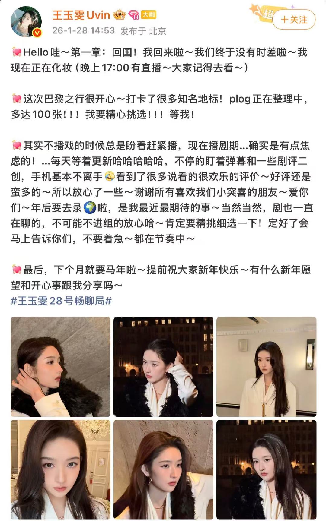 王玉雯的巴黎plog王玉雯年后录地球超新鲜 1月28日,分享了自己的部分巴黎plog,还说年后会录《地球超新鲜》!“这次巴黎之行很开心~打卡了很多知名地标!plog正在整理中,多达100张!!!我要精心挑选!!!等我!年后要去录🌍啦,是我最近最期待的事~当然当然,剧也一直在聊的,不可能不进组的放心哈~肯定要精挑细选一下!定好了会马上告诉你们,不要着急~都在节奏中~”