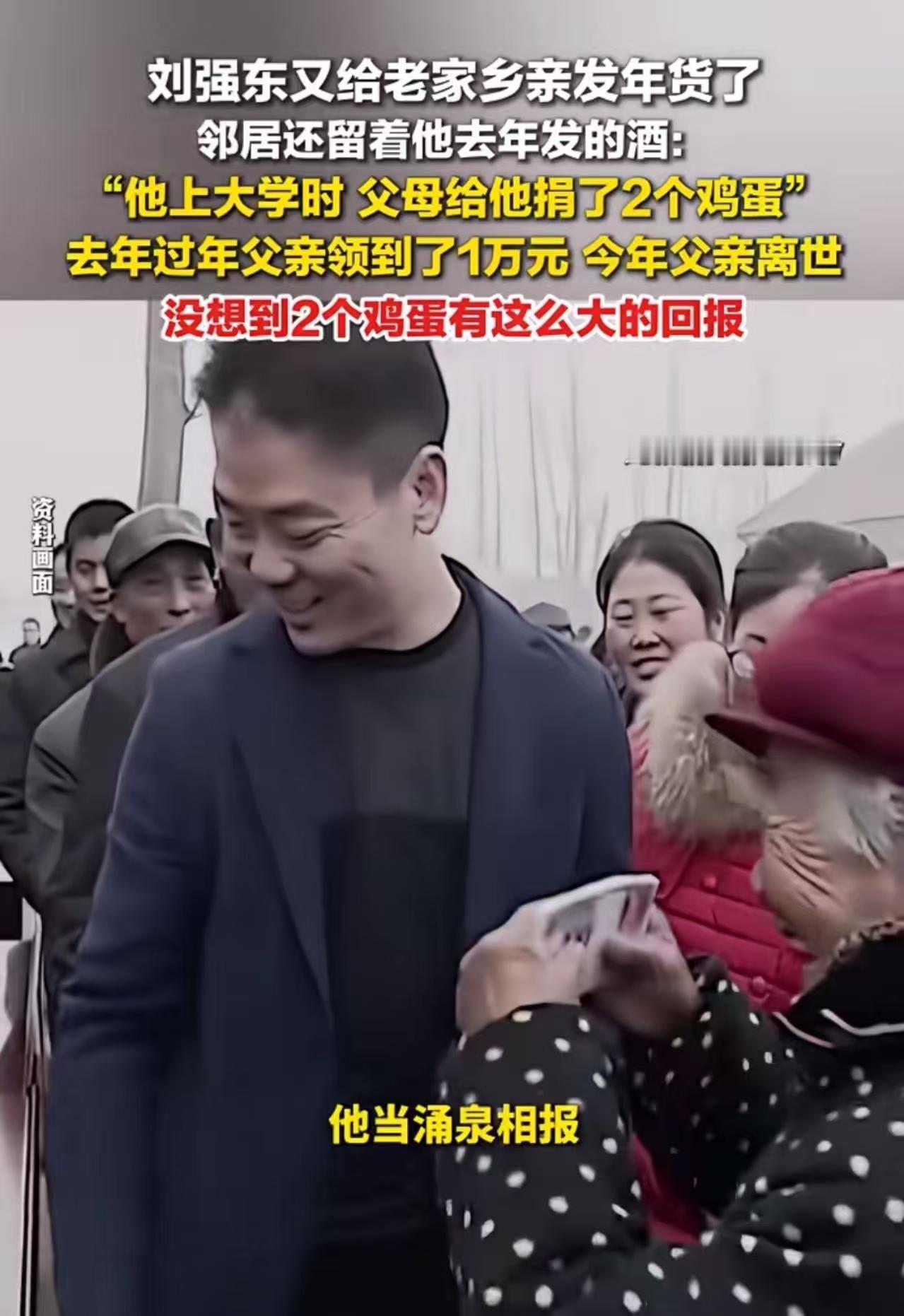 这才是真正的“富而不忘本”!刘强东又给老家乡亲发年货了,一个老奶奶说:“我和老伴两个人领了4万块钱,儿子平时都没给我们这么多钱呢!”网友:这才是实实在在的扶持!假如有一天刘总有困难发不起年货希望乡亲们能理解! 腊月里的江苏宿迁光明村,寒风刺骨,却挡不住村民脸上的热乎劲儿。 村口大喇叭一早就响了:“通知!三轮车、小推车都准备好——东子(刘强东小名)的年货到了!” 今年刘强东为家乡父老准备的年货总额高达3000万元。1500万元现金加上价值1500万的年货。 更让人动容的是发放规则:村里老人,每人2万元现金;一对老夫妻,直接领4万! 王奶奶(化名)攥着刚领到的红彤彤钞票,眼眶泛红:“我和老头子俩,拿了4万块……比我还孩子给我们的钱还多呐!东子这孩子,自己发达了,没忘咱这些穷亲戚啊!” 现场,不少老人边数钱边抹泪。 一位声音颤抖地说:“当年他上大学,家里揭不开锅,我爹妈硬是省下两个鸡蛋塞给他当干粮。谁想到,两个鸡蛋,竟换来这么大的回报!” 原来,上世纪90年代,刘强东考上人大却交不起学费,是全村人你五毛、我一块、他两个鸡蛋地凑,才把他送出了山沟。 那一筐鸡蛋,他记了一辈子。 如今,他不仅年年回乡发年货,还自掏腰包修路、建养老院、设教育基金。 有人曾质疑他“作秀”,可这一“秀”,就是十几年从未间断。 此事引发热议,有网友说,大强子你再上一次大学,5百跟鸡蛋我出了[呲牙] 也有网友说,富了自己没忘家乡的人,我只佩服两个,一个是东哥,一个是美根。 还有网友说,给强哥提点建议,下一年开始,从全国范围内选一个贫困村,过年进行帮扶慰 在这个“成功学”泛滥的时代,太多人把“出人头地”等同于“逃离出身”,仿佛只有斩断乡土、遗忘来处,才算真正“上位”。 而刘强东却用3000万年货,狠狠打了这种势利眼一记耳光——真正的体面,不是住进别墅就忘了土屋;真正的成功,不是登上福布斯就抛弃恩人。 他清楚地知道:没有那一筐鸡蛋,就没有今天的东哥;没有乡亲们当年的一碗米、一句话,他可能早已在贫困中沉没。 所以,他选择用最朴素的方式报恩:不让恩人老无所依,不让善意石沉大海。这不仅是慈善,更是一种对人性底线的坚守! 我们赞美刘强东,不是因为他有钱,而是因为他富而不骄,贵而不忘;不是因为他发了多少钱,而是因为他始终记得——自己是从哪片泥土地里,长出来的。
