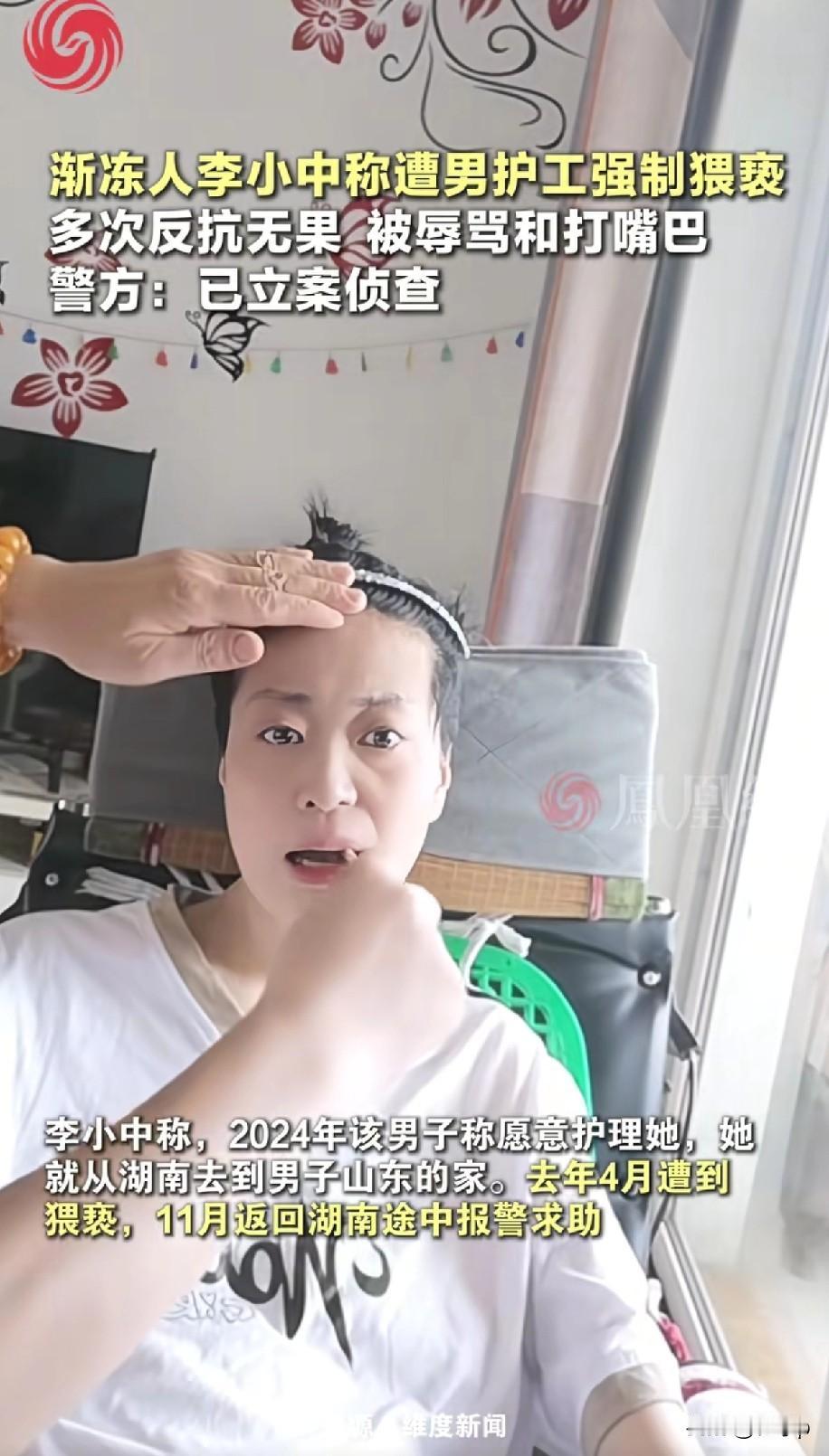 渐冻症患者遭男护工强制猥亵 这位女子是湖南的,2017年患上渐冻症 因为不能说话,生活不能自理 治疗期间换了多位护工,这名男护工是她在2016年认识的,2024年男子说愿意护理她,她从湖南老家包车到山东男子的家里,她称2025年4月份,这名男子多次在无监控区域对她猥亵 还多次辱骂她,并打她嘴巴,11月份回家的时候报警求助,目前警方已经立案调查。 这名男子跟她认识好几年的时间了 既然能承诺能照顾,为何现在又嫌弃, 她已然都是个病人了,还竟然这样对待她,没有那个耐心当初就别答应能照顾人家。