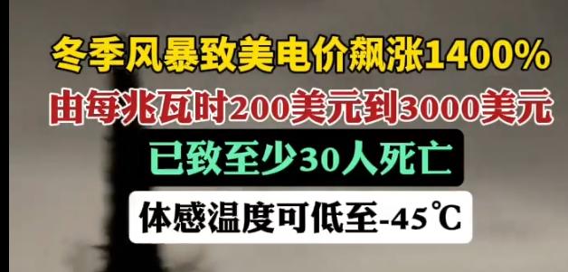 冬季风暴一来, 美多地电价涨到人民币约20元/度, 好像他们平时居民电价大概1元出头/度, 这一下直接翻了十几倍。 平时美国普通人拿出几百美元都难, 这一下电价涨了十几倍, 不是让他们吃饭取暖二选一么? 风暴一来就在基础民生上大刀割肉, 趁火打劫都不为过,加上物资短缺, 妥妥的雪上加霜。 美国普通人斩杀线不就这样么, 不论天灾还是人祸, 他们真的没啥抵抗力。 愿风暴早日过去吧, 供电恢复,电价回归正常, 让美国的普通人能少受点苦。