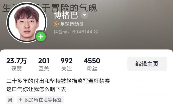 张浩的社媒主页上写着:二十多年的付出和坚持被轻描淡写冤枉禁赛这口气你让我怎么咽下