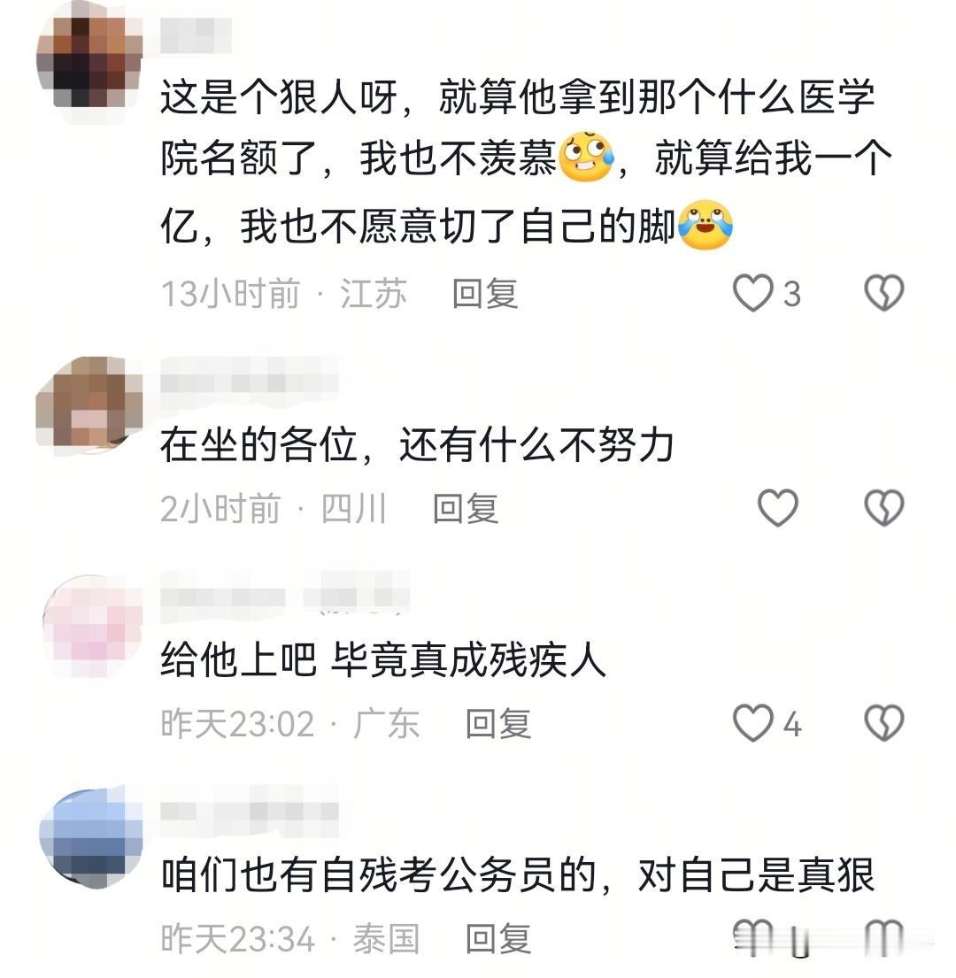 “这绝对是个狠人啊。” 只听说过断臂求生,居然还有断脚求学。印度一男子为了上医学院,但自己却又考不上,居然把自己的一只脚砍断,试图以残疾人名额入学。 据了解,这名男子20岁左右,连续两次考试都未通过,所以试图砍断自己一只脚,获得医学院残疾人的入学名额。 事后其哥哥向警方报案称弟弟被不明袭击者的袭击之后,一只脚被砍断。 不过经警方立案调查,发现两人的供词矛盾,且男子的伤口断面干净,疑似机器切断,并且还在他们家附近找到了麻醉药物。 最终警方判断这是男子自己所为。 真的是个狠人啊,对自己太狠了,居然有那么大的决心要上医学院,不过事情败露现在也上不了,还变成了残疾人。 这名男子是看了葵花宝典吗?欲练此功必先自宫。 有网友说,有这样的决心和意志力干什么都会成功的。 不过也有网友说这样的人太极端。 对这件事您怎么看呢?欢迎表达您的观点。