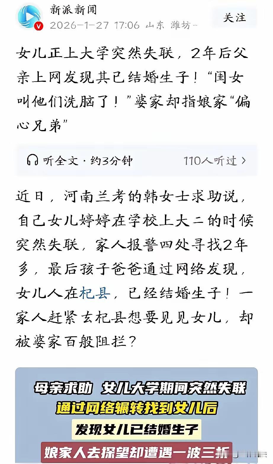 这闺女不要也罢! 说起自己的女儿,河南兰考的韩女士真是欲哭无泪!女儿婷婷在上大二时突然失联,韩女士老两口发疯似的到处寻找,费尽了心血和钱财,但始终没找到! 两年过去了,正当他们绝望的时候,老伴突然在网上刷到了女儿婷婷的身影,现在正在百里外的杞县,已经结婚生子!老两口又惊又喜,赶紧前往,想要寻回女儿! 没想到,老两口在婷婷家吃了闭门羹!后来他们找了调解员,也只是见到了婷婷的婆婆。婷婷让婆婆转达:今生不想再回兰考!自己小时候,妈妈只喜欢弟弟,经常打自己,就连自己发烧也不管,还让穿破旧衣服理短发,导致经常被同学嘲笑! 韩女士承认,自己是打过婷婷,但那是她不好好学习的时候。那时候家里穷,弟弟的吃穿也不好,自己并没有偏心。但无论她怎么解释,婷婷就是铁了心,绝不跟他们回去,以至于老父亲放出狠话:就是绑也得把闺女绑回去! 婷婷在大二的时候,意外怀孕,到了六个月的时候,只好跟着男友回到了杞县,从此没再继续学业,直接成了年轻的妈妈!韩女士觉得是男方给女儿洗了脑,他家的生活环境也不太好,自己是真想把女儿带回去! 但一切都是徒劳!韩女士老两口自己心灰意冷的回到了老家,后来生了场重病,发照片让婷婷看,希望她能回来看看,但女儿说那照片是假的! 这个闺女太狠心!不要也罢!她只记住了父母犯的错,但把她养大,供她读书,父母对她的好半分不提,实在是令人寒心!