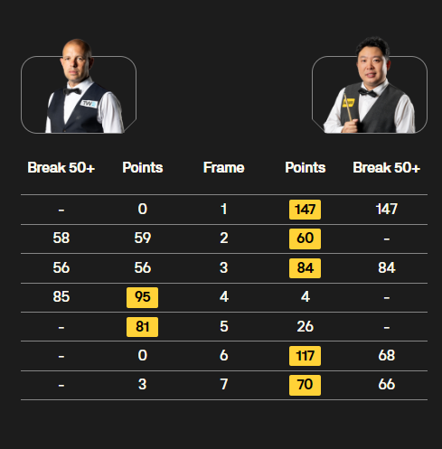 全场比赛,张安达打出一杆147和三杆50+(84、68、66),霍金斯打出三杆50+(58、56、85)