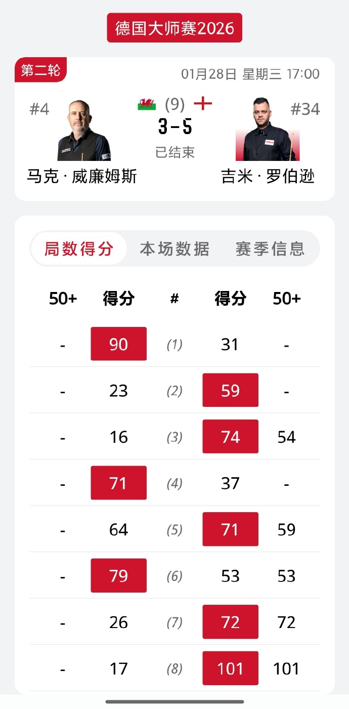 虎扑01月28日讯在2026斯诺克德国大师赛32进16轮次里,马克-威廉姆斯发挥不佳,3-5不敌吉米-罗伯逊,被淘汰出局。