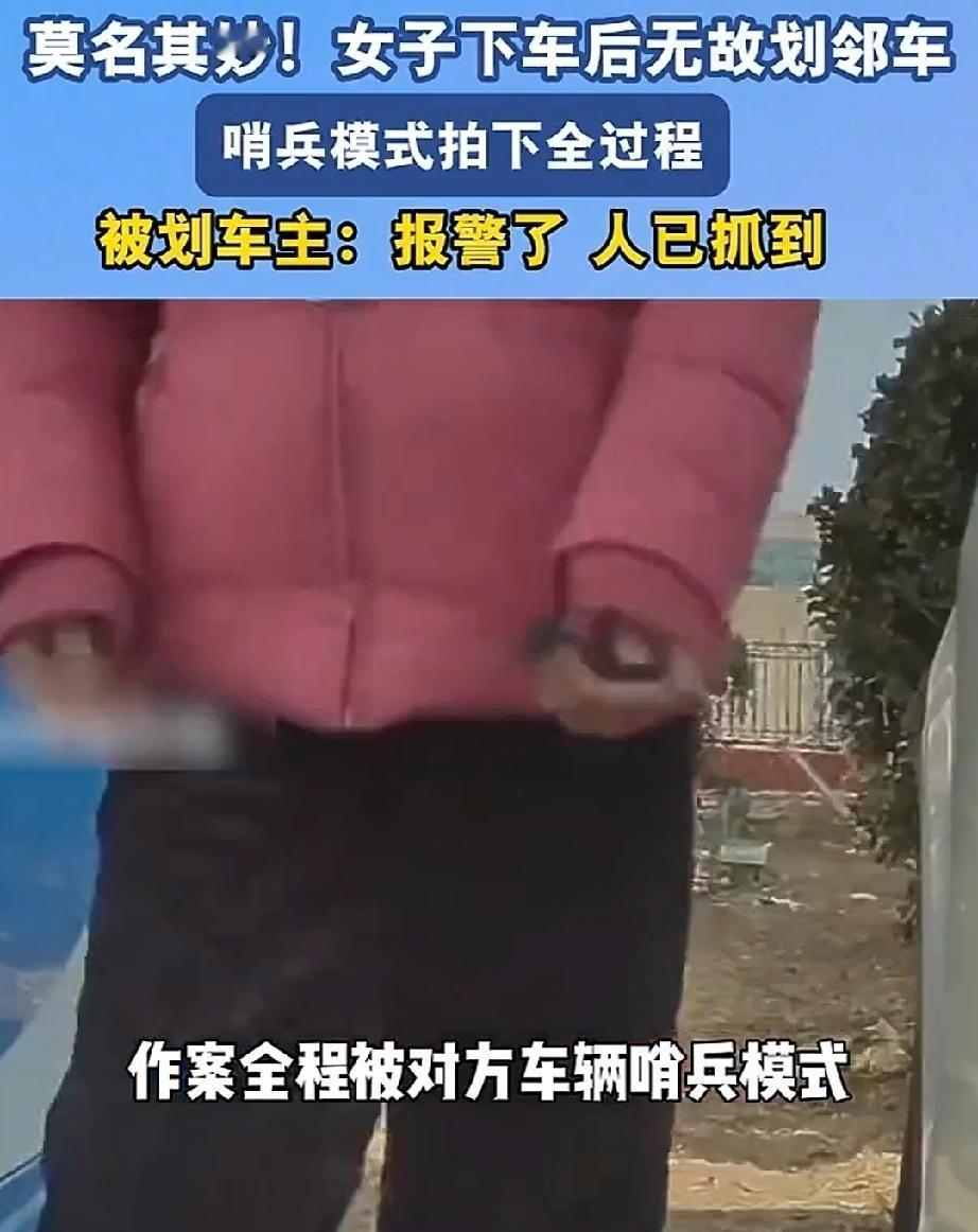 12月27日,河北。女子驾驶蓝色的车,停在白色轿车旁边。下车后,拿着钥匙缩在衣袖口。看看周围没人,将 白色轿车划花后,匆匆离去。 女子以为自己做的神不知鬼不觉。哪知道白色轿车开启了哨兵模式,将女子做案行为的一举一动全程拍下。白车车主报了警,女子被抓获。 举头三尺有神明,社会公德不容破坏。也许女子对白色轿车有什怨恨,但不能采取这种方式损害他人财产,这是违法行为。女子也将为此行为,承担应负的责任。 女子无故划邻车被哨兵模式拍下女子划车 车钥匙划车