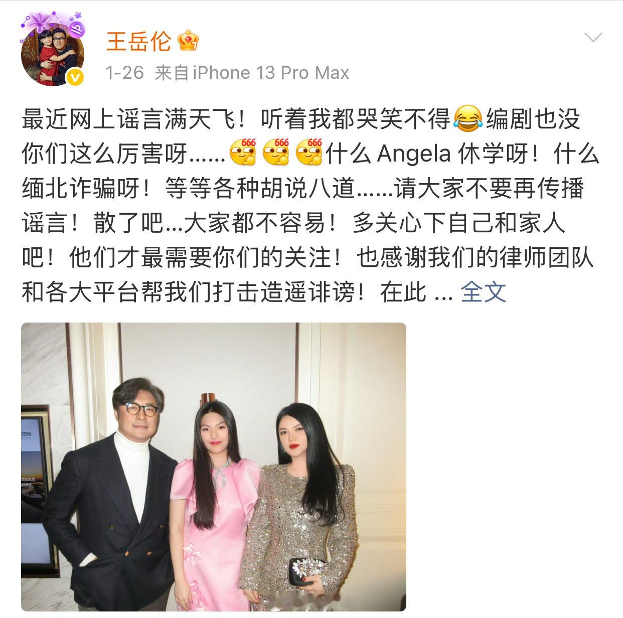 王岳伦发文挺李湘,赵薇兄长发文替其辟谣律师明星律师王岳伦李湘王诗龄 近日,王岳伦通过个人微博发文:“最近谣言满天飞!听着我都哭笑不得,编剧也没你们这么厉害呀,什么Angela(其女儿王诗龄)休学呀!什么缅北诈骗(网传其前妻李湘涉及缅北诈骗)呀!等等各种胡说八道……请大家不要再传播谣言!散了吧!…大家都不容易!多关心一下自己和家人吧!他们才最需要你们的关注!也感谢我们的律师团队和各大平台帮我们打击造谣诽谤!……”说到各大平台,李湘于2026年1月16日遭各大平台标记为“禁止关注”,如果对其关注,则提示“违反法律法规或社区公约”。网友对此产生各种猜测,但王岳伦此次发微博并未回应李湘社交账号遭全网“禁止关注”的关键争议。网友认为账号封禁才是舆论发酵的主因,直言“为何不说明封号问题?”。而王岳伦关闭微博评论功能,被指缺乏互动诚意。有网友表示:“若真无隐情,为何不敢开放评论?”。王岳伦与李湘自2021年离婚后始终保持友好互动,多次合体陪伴女儿王诗龄(如赴香港听演唱会、英国看画展),侧重情感陪伴,与李湘共同形成以孩子利益优先的合作模式。 同日赵薇兄长发声明否认“赵薇洗钱”谣言,揭露自媒体造谣产业链,与王岳伦的维权形成呼应,反映名人应对不实信息时普遍依赖法律手段,但维权效率常落后于谣言传播速度。李湘账号被封的具体原因尚未经任何官方渠道证实,网友推测可能存在误导;“缅北诈骗”等恶性传闻的源头未明,需以警方或平台后续通报为准。从王岳伦微博可以看出,已经委托律师团队联合平台打击造谣诽谤行为。造谣诽谤可能涉及行政与刑事两类案件,核心区别在于危害程度。依据《治安管理处罚法》第四十二条,公然捏造事实诽谤他人,尚不构成犯罪的,可处拘留或罚款。其门槛较低,只要有散布谣言、损害他人名誉的违法行为即可成立。依据《刑法》第二百四十六条,需达到“情节严重”标准,如导致被害人精神失常、自杀;信息被广泛传播造成恶劣影响;或多次实施诽谤。通常为自诉案件,严重危害社会秩序或国家利益的,可由公安机关立案侦查,进行公诉。我是吴律师,下期见。
