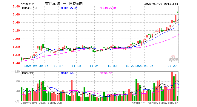 1月29日,有色金属ETF(159871)开盘涨3.26%,报2.657元。有色金属ETF(159871)重仓股方面,紫金矿业开盘涨3.52%,洛阳钼业涨2.57%,北方稀土涨2.08%,华友钴业跌0.94%,中国铝业涨2.81%,赣锋锂业跌1.96%,山东黄金涨7.27%,云铝股份涨1.84%,中金黄金涨6.05%,中矿资源跌2.59%。