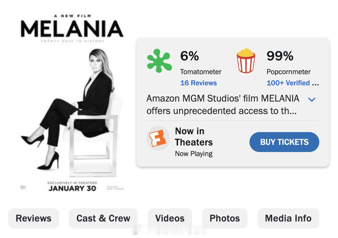 目前烂番茄上,影评人新鲜度评分是6%,观众口碑为99%。