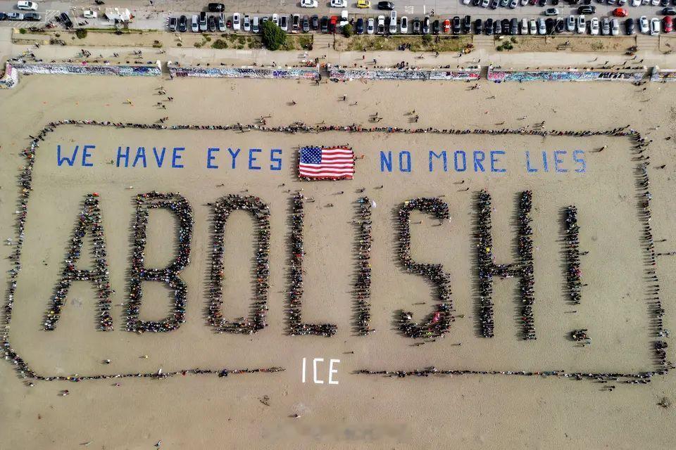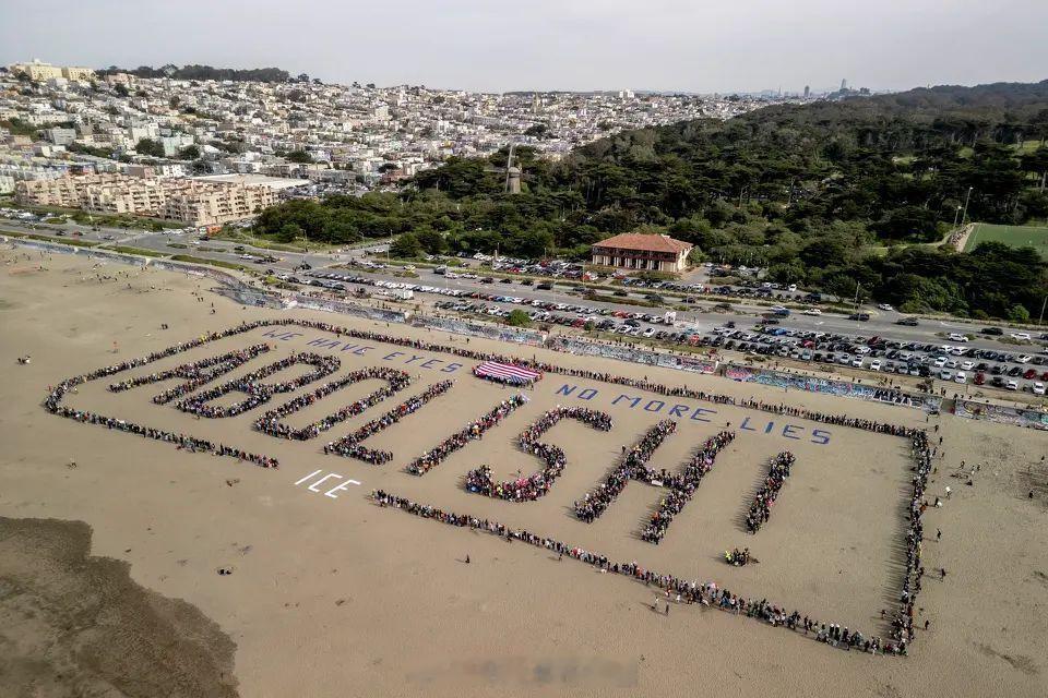 今天数百名抗议者走上旧金山的海洋海滩,用人群组成“废除ICE”的字样,以回应近期明尼阿波利斯移民执法人员的致命枪击事件。